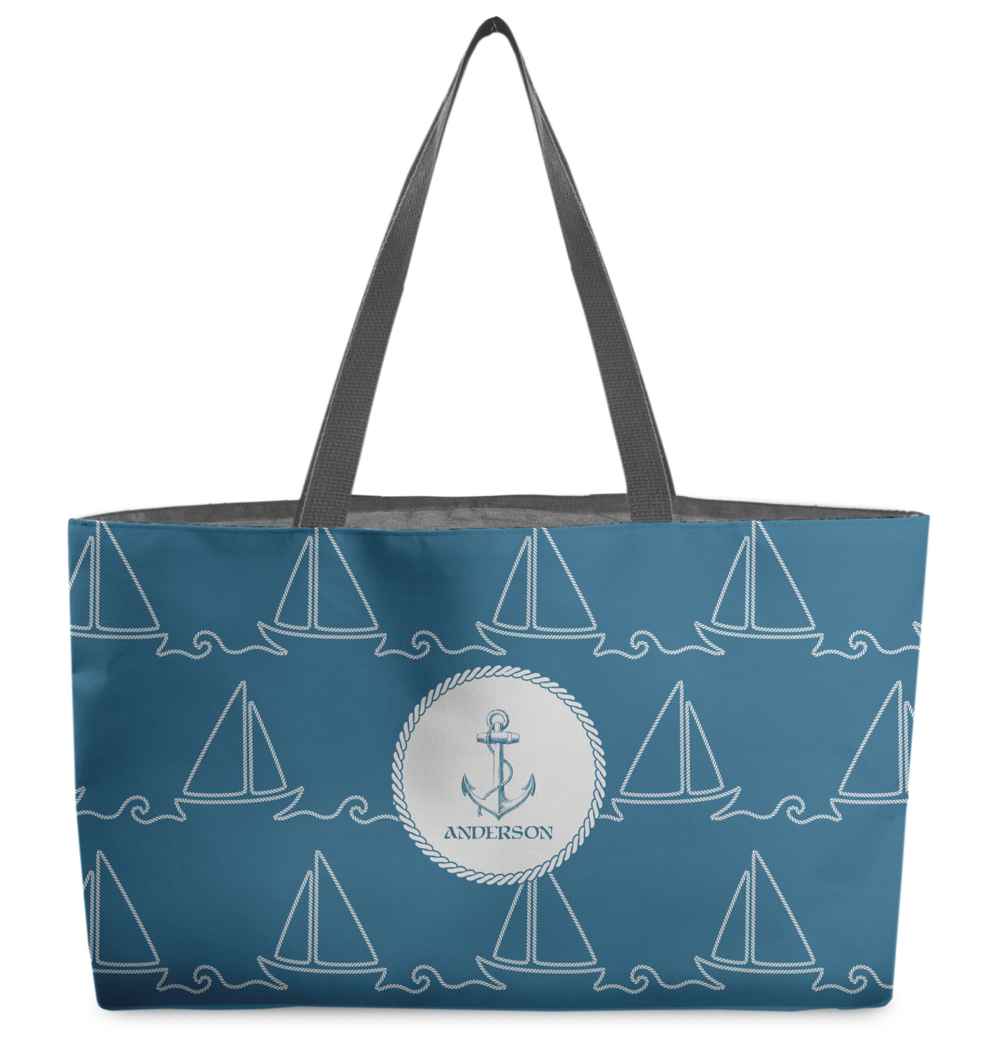These beach totes are handmade here in the USA. Fabric is printed with your design. The tote is then sewn from the fabric pieces, lining and handles added.