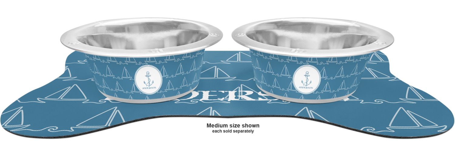 The top of this mat displays your custom design, as it is printed on polyester. To prevent slippage, the underside of the mat is made of rubber. We offer a small dog food mat, suitable for smaller dogs and a large dog food mat for bigger breeds. The small dog food mat is approximately 19 by 13 inches, while the large dog feeding mat measures at approximately 26.75 by 18 inches. Both personalized mats are ideally sized to fit two dog bowls.