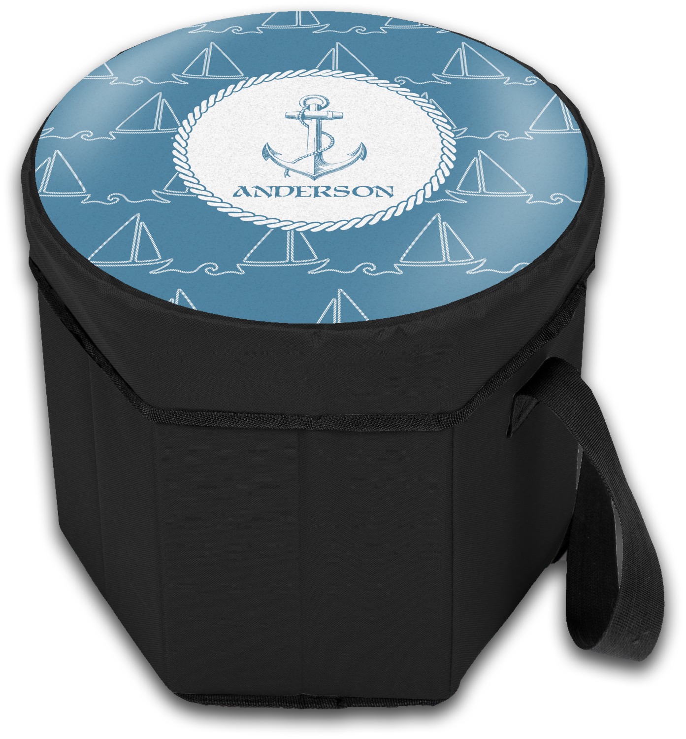 Our collapsible insulated coolers feature a unique six-sided hexagon shape, are lightweight, durable and can be turned into a seat. This cooler is fully insulated with silver foil lining to keep food and drinks hot or cold, and has a 12-quart capacity. Although this cooler collapses for easy transport, hidden inside are composition panels made of sturdy wood that give the frame strength and allow this cooler to be used as a seat. Simply sit down on the personalized cover and give your legs a break! (Maximum weight capacity of 200 pounds.)