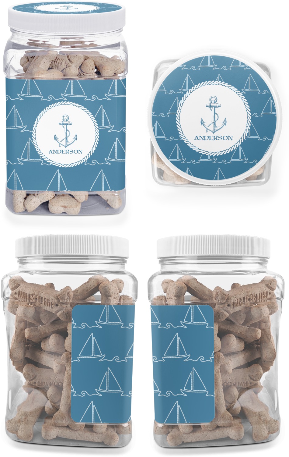 This half gallon jar, made from a sturdy plastic, is the perfect way to keep treats from any naughty pet paws, while still keeping them ready on hand for when your pup performs an impressive trick. This dog cookie jar features a screw-on, white lid that displays your personalized design on a vinyl sticker. We apply another customized sticker that wraps around the front and sides of the jar. Our dog treat jar also has indentations on the rear ends of the sides, which allows for convenient handling, and its square frame allows for easy storage.