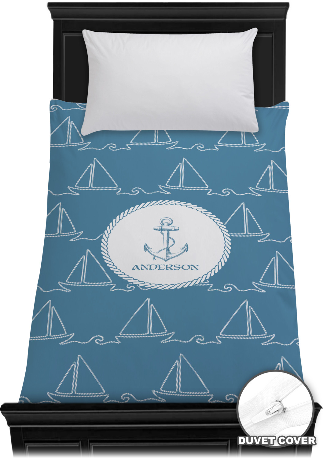 In the center of the design is a roped label and anchor. Put the personalization of your choice underneath.