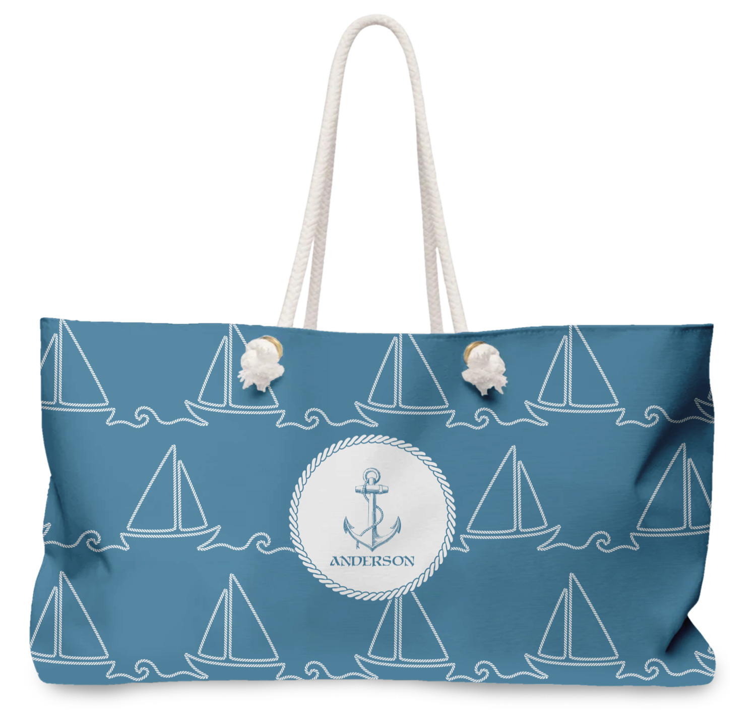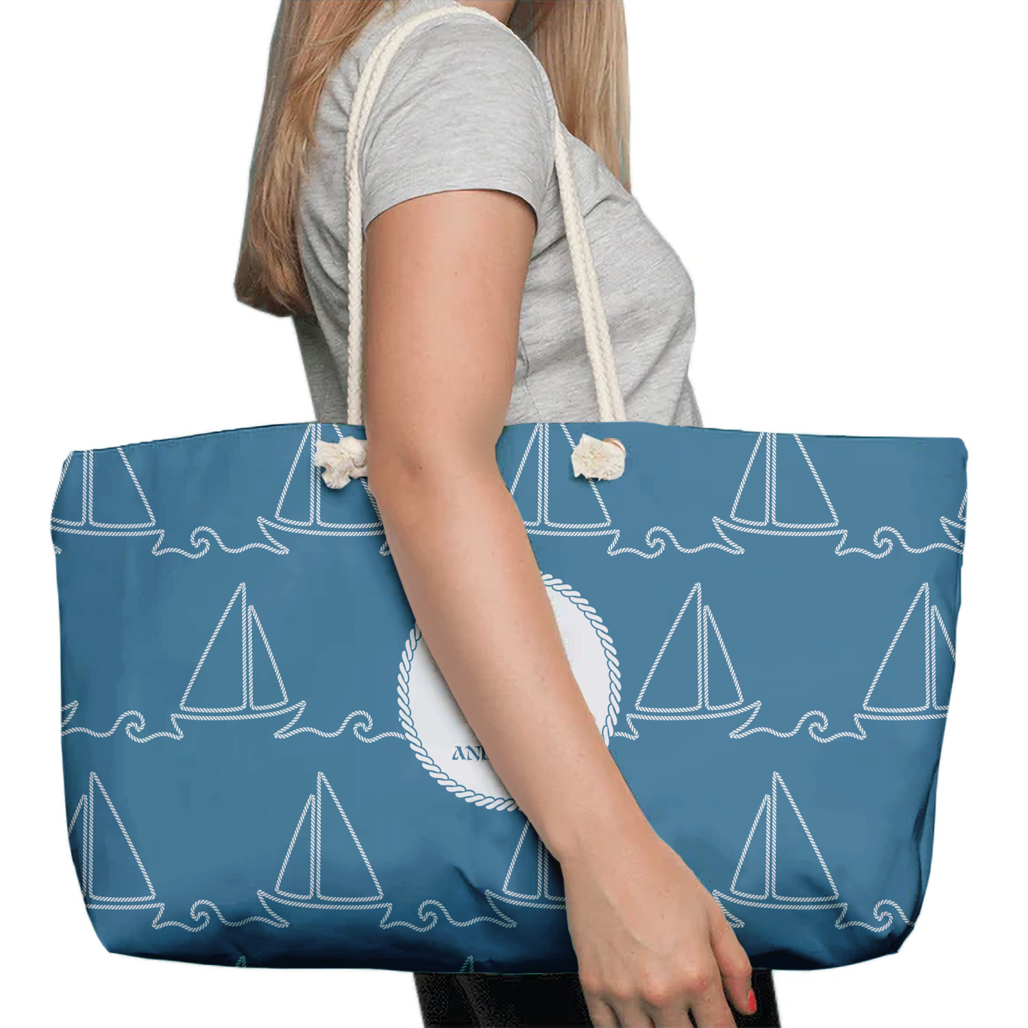 Our oversized weekender tote with rope handles is perfect for your weekend at the beach or on the town. This large tote are 24" W X 13" H, with a 5" gusset and a 27" thick rope handles with a knot that is put through a grommeted brass hole.