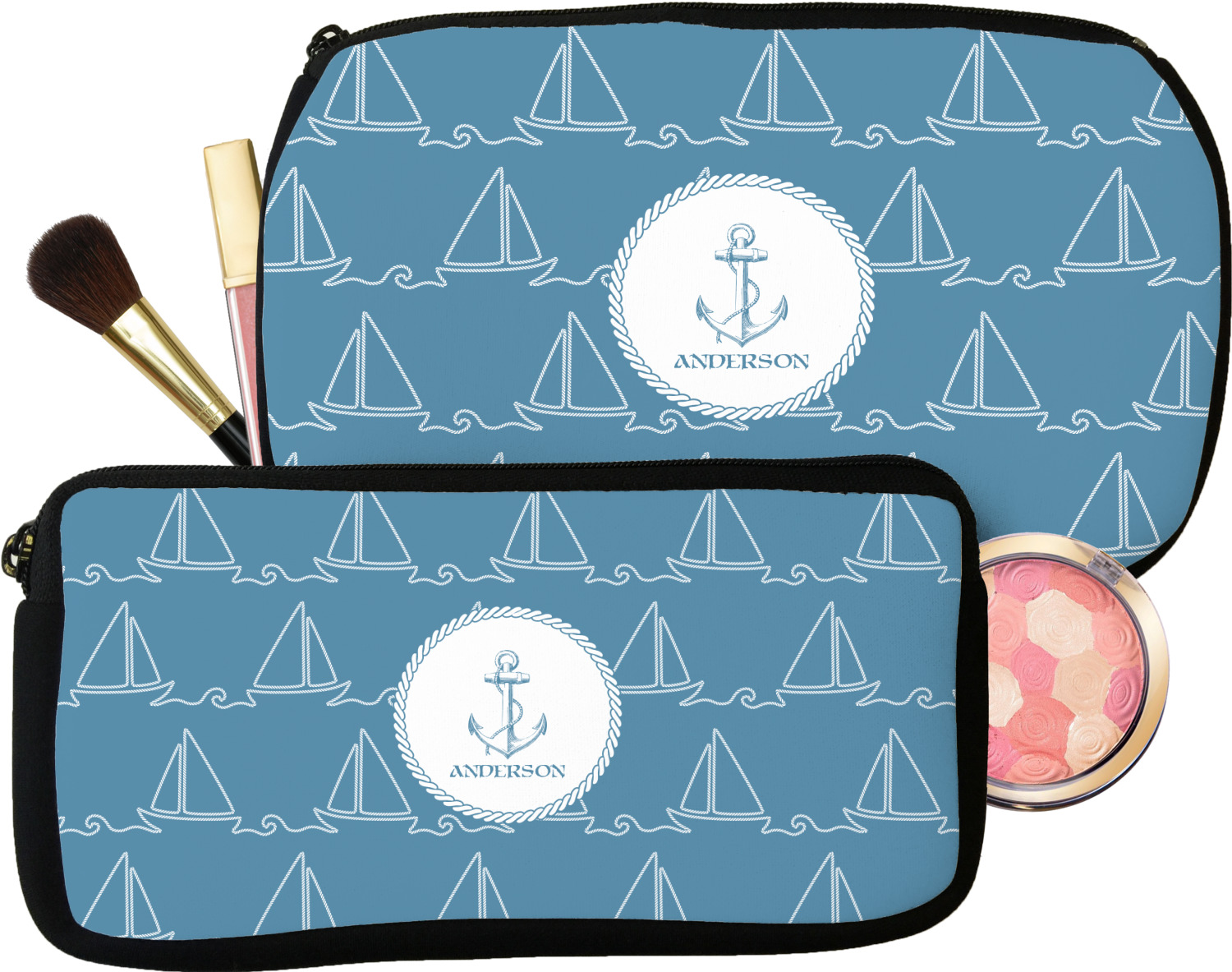 Our makeup bags are available in 2 sizes, small for smaller purses and less makeup, while the medium one for larger purses, as well as more makeup. Neither one of these is big enough for me when I am traveling - so, we do carry custom toiletry bags for travel.