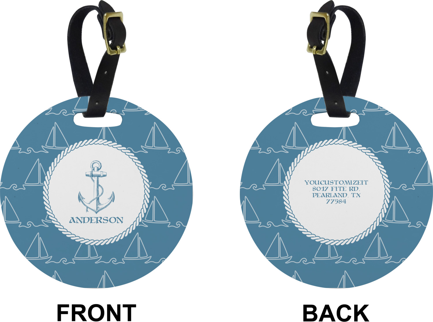These personalized bag tags are sold in a variety of shapes, so that you may find the product that meets your vision exactly. We sell a round luggage tag, which measures at approximately 4" x 4". Our square luggage tag is about 3.5" x 3.5", while our rectangular version is 2.75" x 4 ".