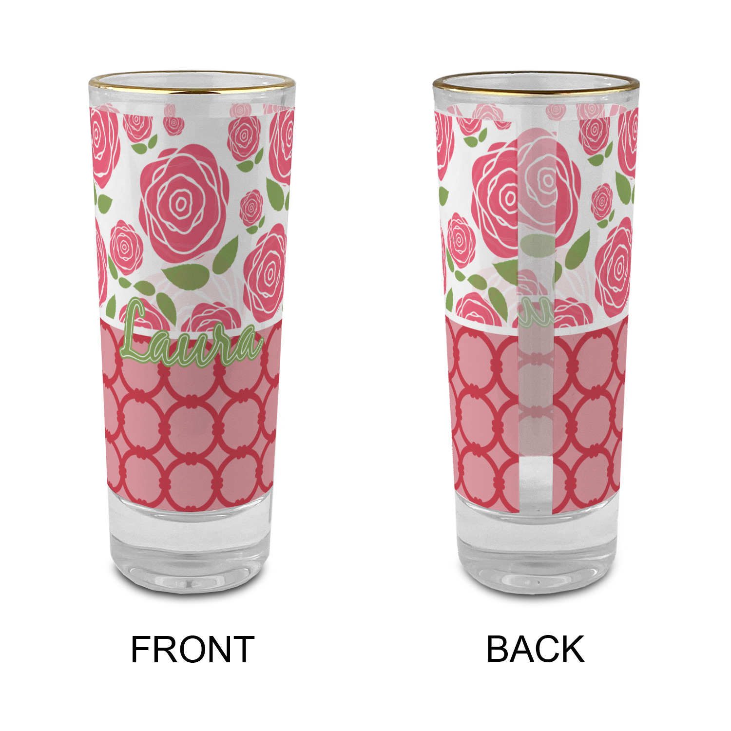 These glass shooter glasses are printed in full color with the design of your choice. These are a tall shooter 2 oz size and stand 4" tall. The print is a full wrap design to boldly display your personalization.