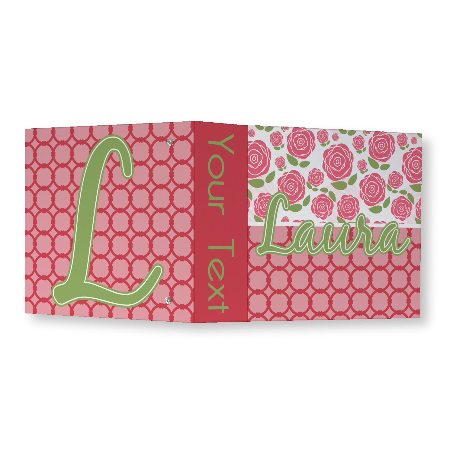 Made from a sturdy cardboard base with a full high quality canvas textured vinyl wrap with the design of your choice. Unlike our standard 3-ring binder with the full wrap design your artwork wraps from the front and back and into the inside of the binder.