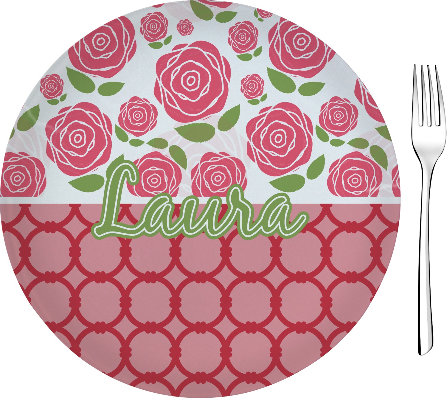 For our two pattern layout design, we chose to pair the rose pattern with our connected circles tone on tone design. We chose to personalize with just a name in one of our popular fonts (Black Jack) and we put a double stroke on the name.