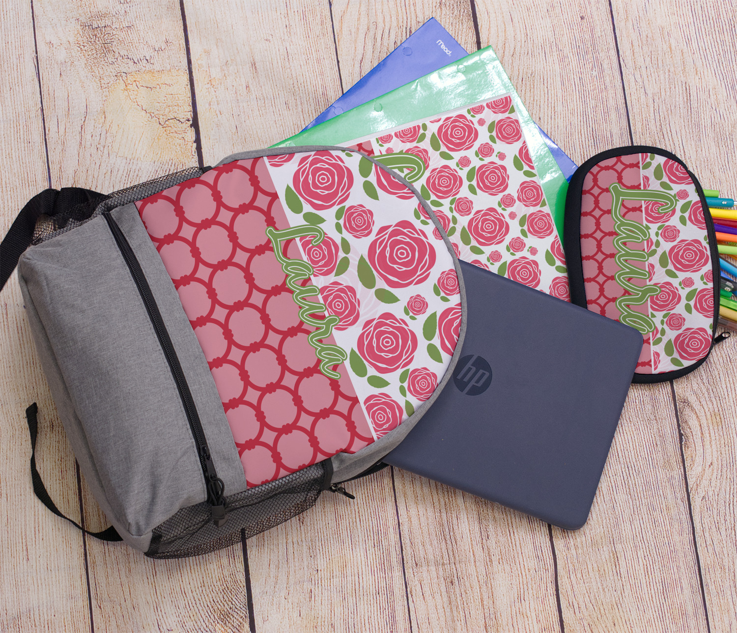 For our two pattern layout design, we chose to pair the rose pattern with our connected circles tone on tone design. We chose to personalize with just a name in one of our popular fonts (Black Jack) and we put a double stroke on the name.