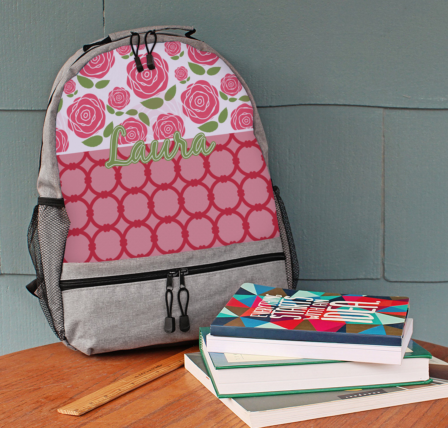For our two pattern layout design, we chose to pair the rose pattern with our connected circles tone on tone design. We chose to personalize with just a name in one of our popular fonts (Black Jack) and we put a double stroke on the name.