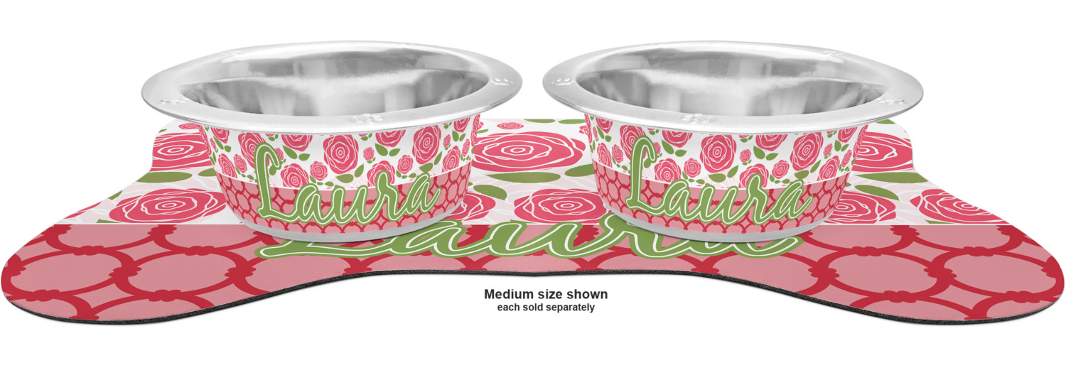 The top of this mat displays your custom design, as it is printed on polyester. To prevent slippage, the underside of the mat is made of rubber. We offer a small dog food mat, suitable for smaller dogs and a large dog food mat for bigger breeds. The small dog food mat is approximately 19 by 13 inches, while the large dog feeding mat measures at approximately 26.75 by 18 inches. Both personalized mats are ideally sized to fit two dog bowls.