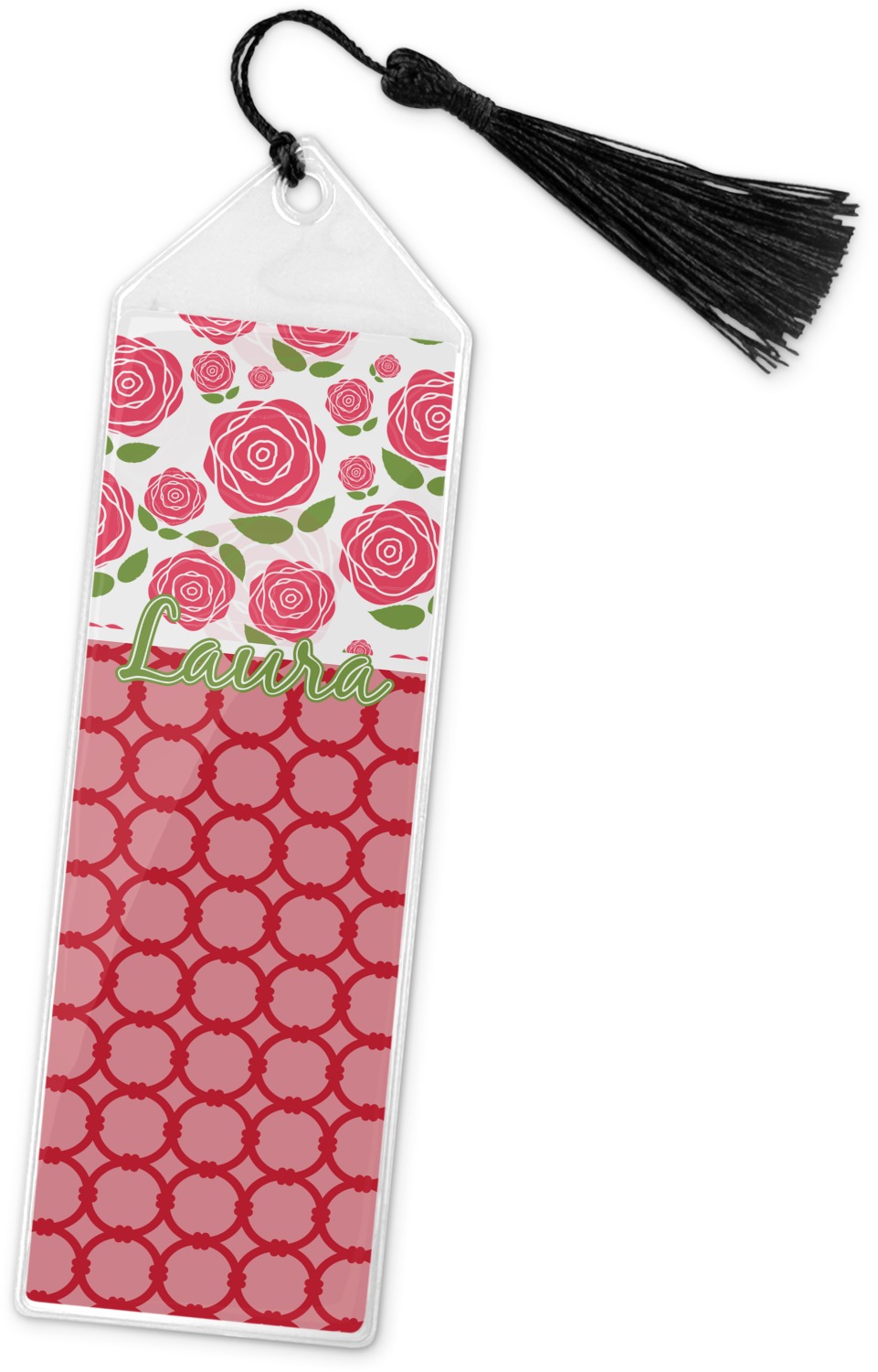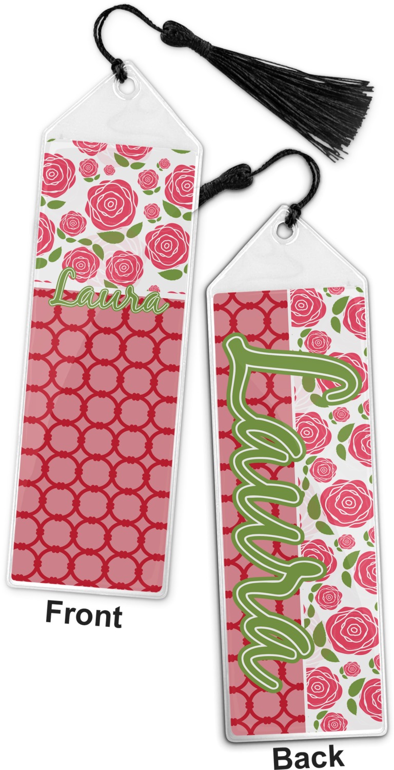 Your personalized bookmark is made of a sturdy, clear vinyl, and is approximately 7.5" x 2.25". We display your personalization on vinyl inserts that are placed on both sides. Accompanying each book marker is a black, fringe tassel that attaches to the reinforced, triangular header.