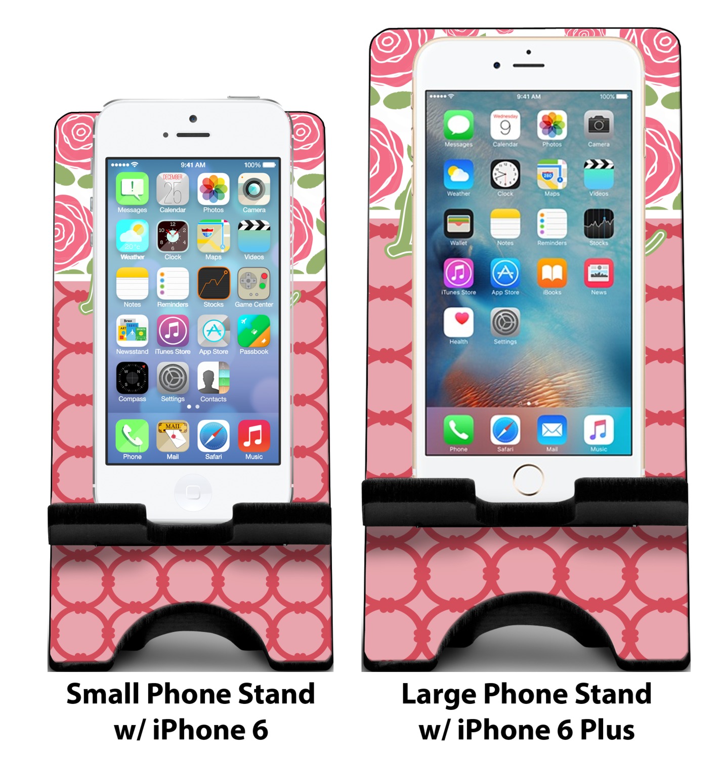 To meet your needs, we offer four variations of this IPhone stand. The backboard of the first version is shaped as a plain, yet sleek rectangle, and is available in two sizes. Our smaller size is approximately 4 by 3.25 by 7 inches, while the larger model is 4 by 3.77 by 8.5 inches. Alongside this model, we also provide you with a more decorative option. The upper part of our second version features a curved edge, for a classy, suave appearance. This phone holder is also sold in two sizes: a smaller version, which is 4 by 3.25 by 7 inches, and our larger model, which is 4 by 3.77 by 8.5 inches. Both models will support large phones, but the larger model is better if you wish to proudly display your personalized design.