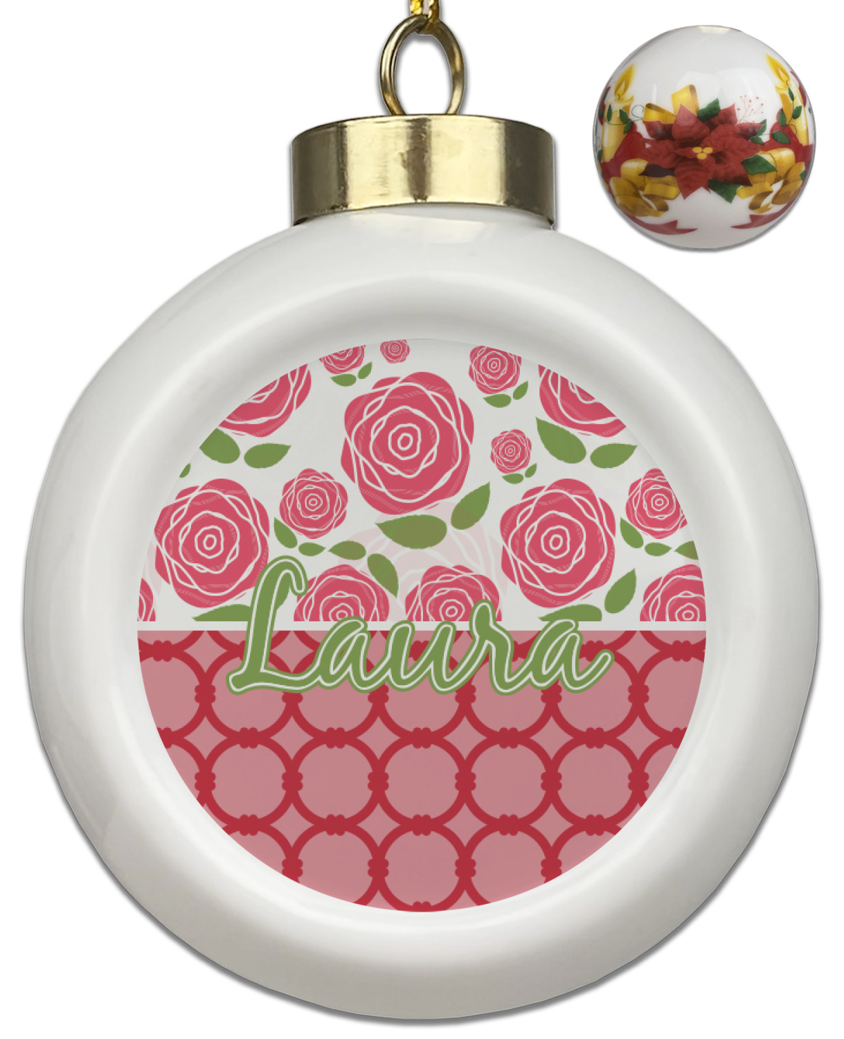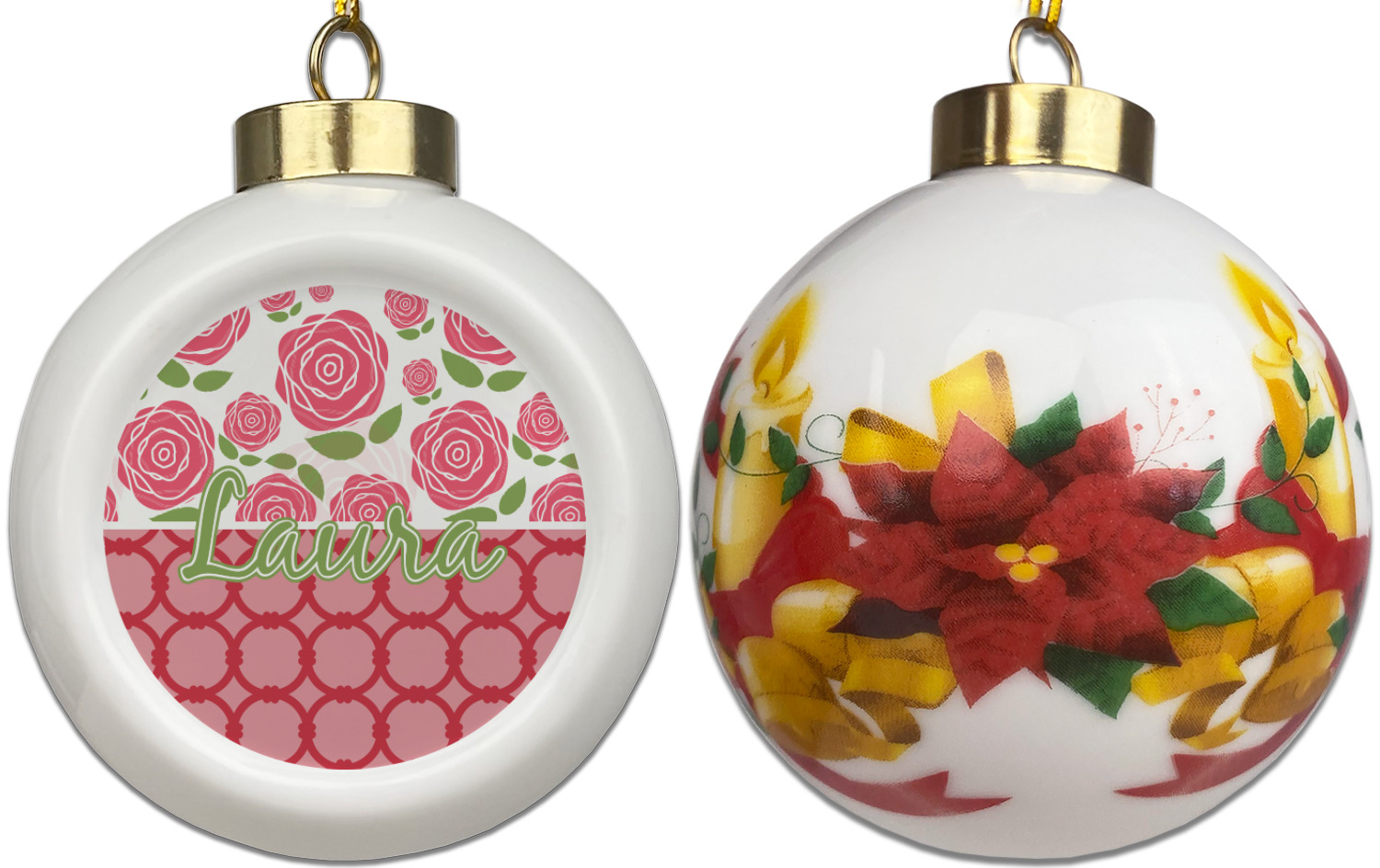 Our Christmas ornaments are a unique ceramic ball shape with a twist as it has a flat face to display your custom design! Select from one of our two design types - Christmas Tree or Poinsettia Garland - to adorn the curved back of your personal design. Each ornament measures 3H x 2.5W x 2D accompanied with a gold string accent for finishing touches to hang on your beautiful Christmas tree!