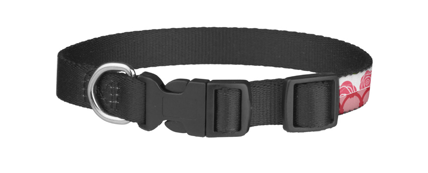 This sturdy collar, made from a durable nylon weave, will outlive your dog's episodes of excited tugging and pulling. Courtesy of its thick plastic buckle and adjuster, this collar is adjustable and accommodating of any dog. Structurally, the collar is a single piece of nylon weave that is sewn together, and features a solid metal loop where you can attach a leash or dog tag. We print and display your dog's name and pattern across the middle of the personalized dog collar.