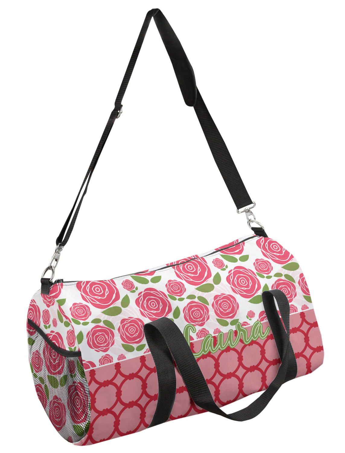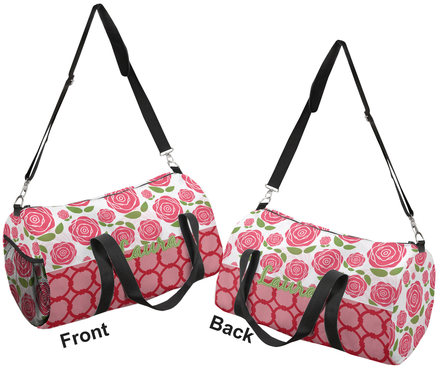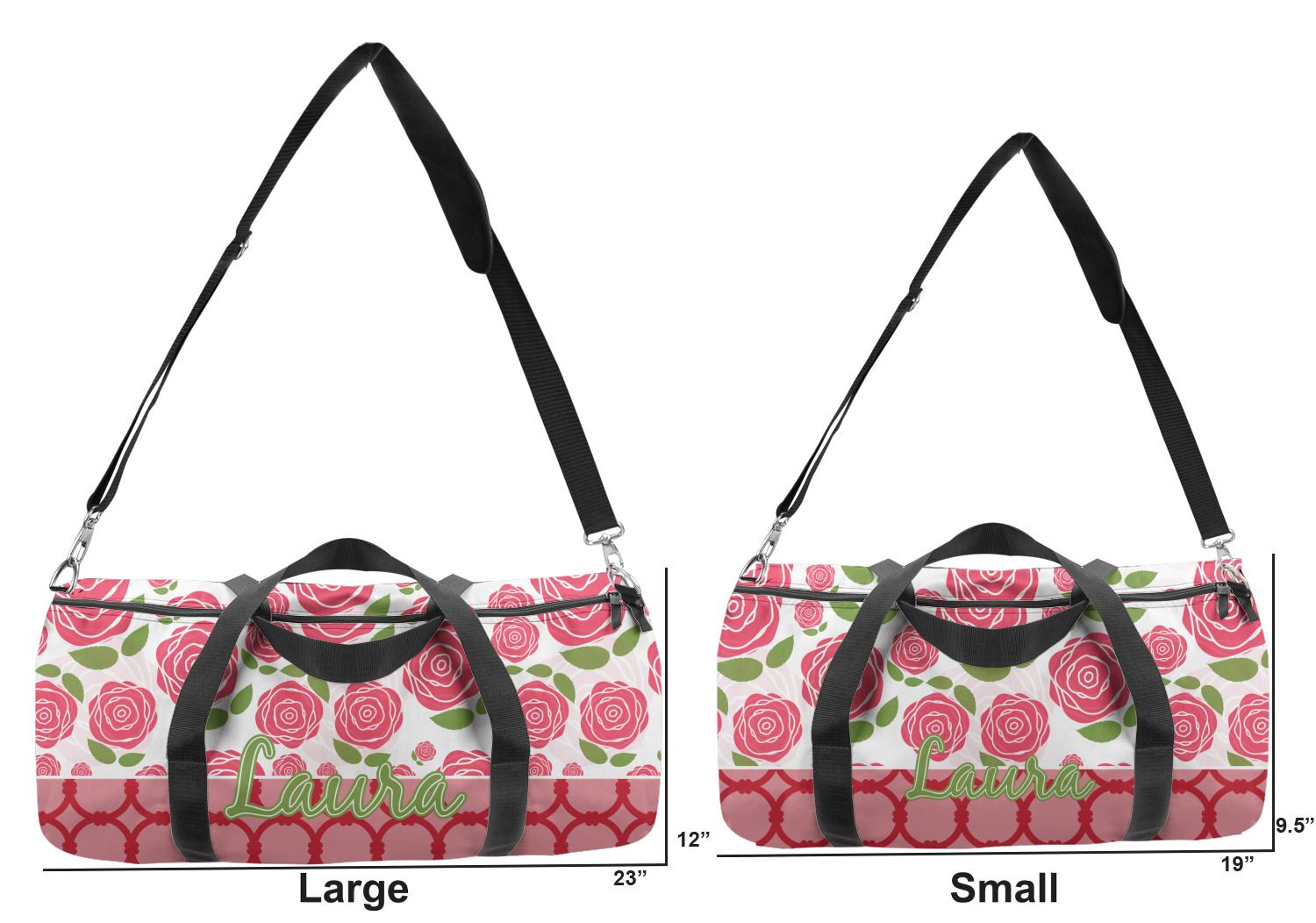 This duffle is a sturdy bag made of a canvas material. It comes in two sizes: Small (19"W x 9.5"H x 9.5"D) and Large (23"W x 12"H x 12"D). The bag is a cylindrical shape with a black adjustable strap and two handles. On one side is an elastic pouch to put a waterbottle or other small item. Your product will be sublimated with your design and is able to be designed on the front, back, and sides. Be sure to remember that the straps may cut into parts of your design if you upload your own artwork.
