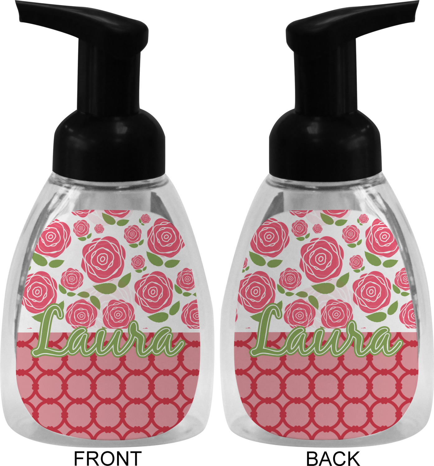 This soap dispenser is made of a robust plastic and has a clear base. The included soap pump is available in black or white color. This dispenser is 6.5 inches tall, 3 inches wide, and 2 inches deep. We display your customized designs on the front and back sides of these foaming hand soap dispensers.