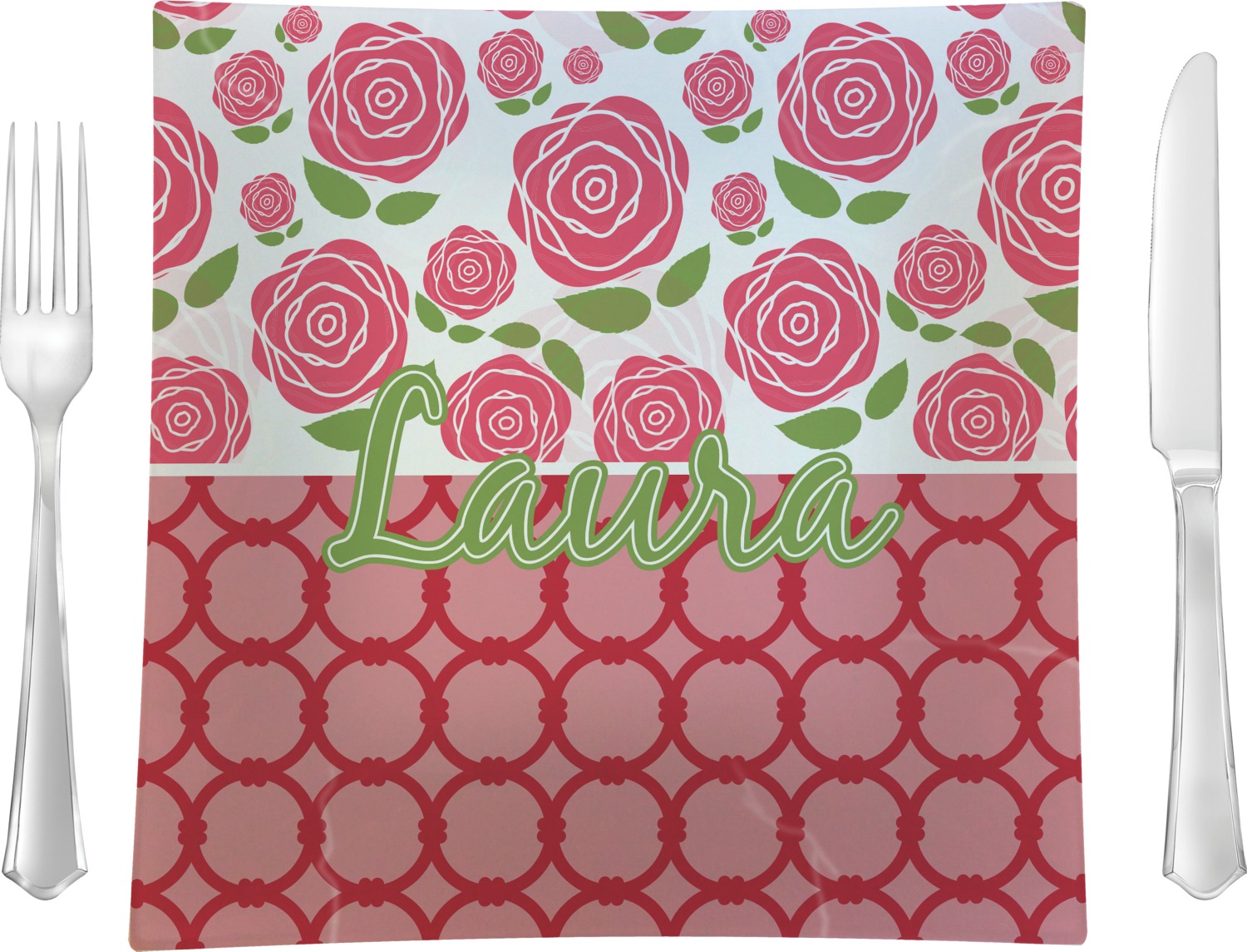 For our two pattern layout design, we chose to pair the rose pattern with our connected circles tone on tone design. We chose to personalize with just a name in one of our popular fonts (Black Jack) and we put a double stroke on the name.