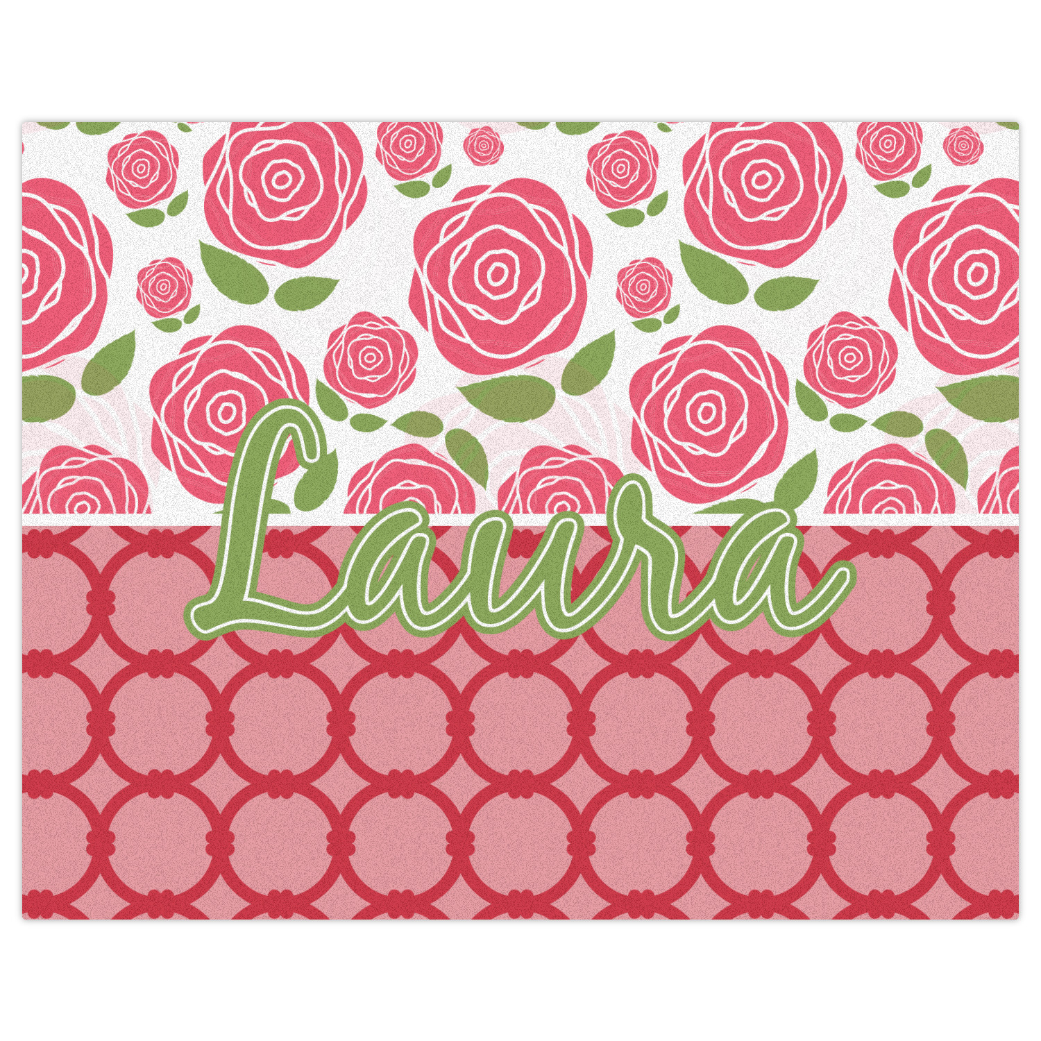 For our two pattern layout design, we chose to pair the rose pattern with our connected circles tone on tone design. We chose to personalize with just a name in one of our popular fonts (Black Jack) and we put a double stroke on the name.