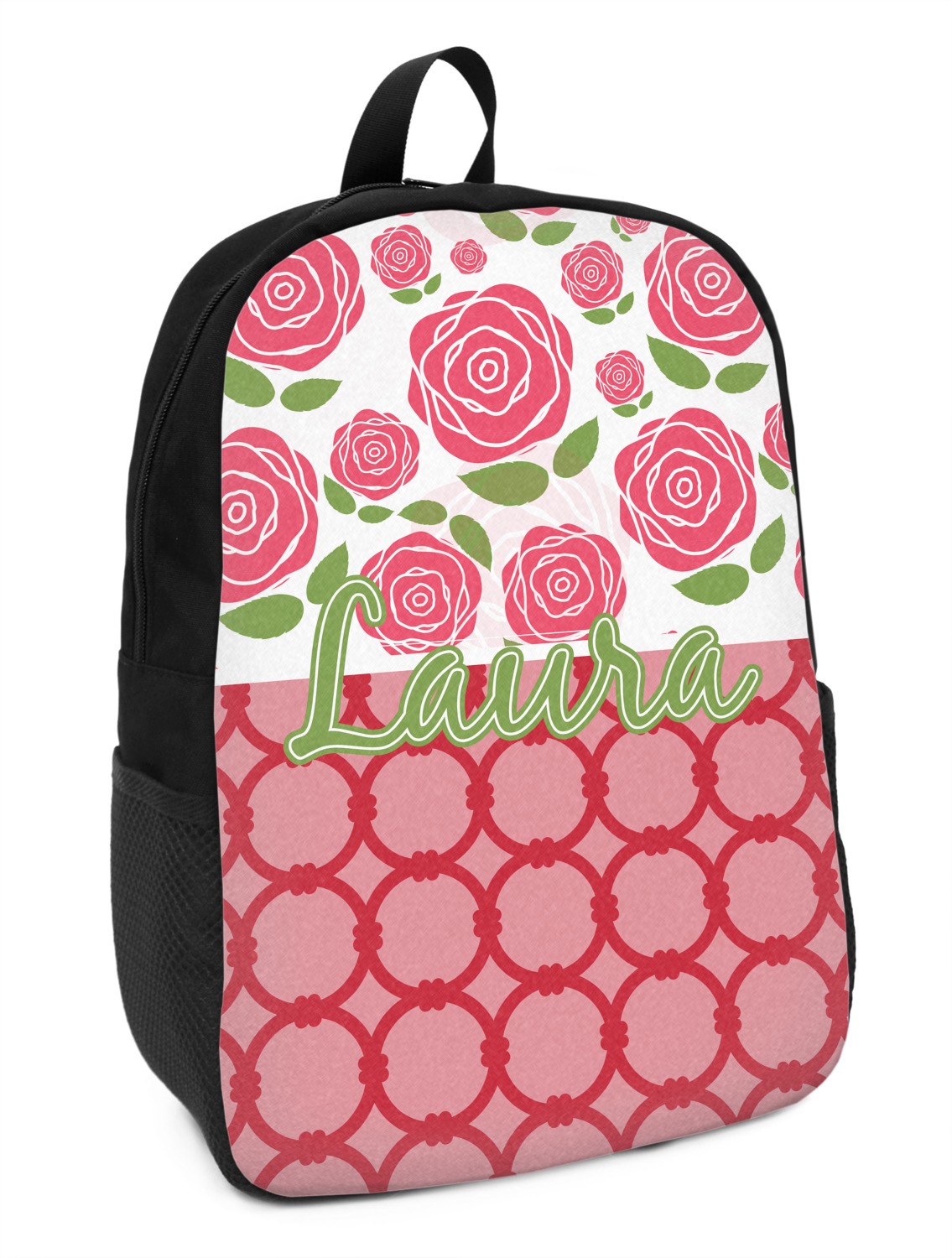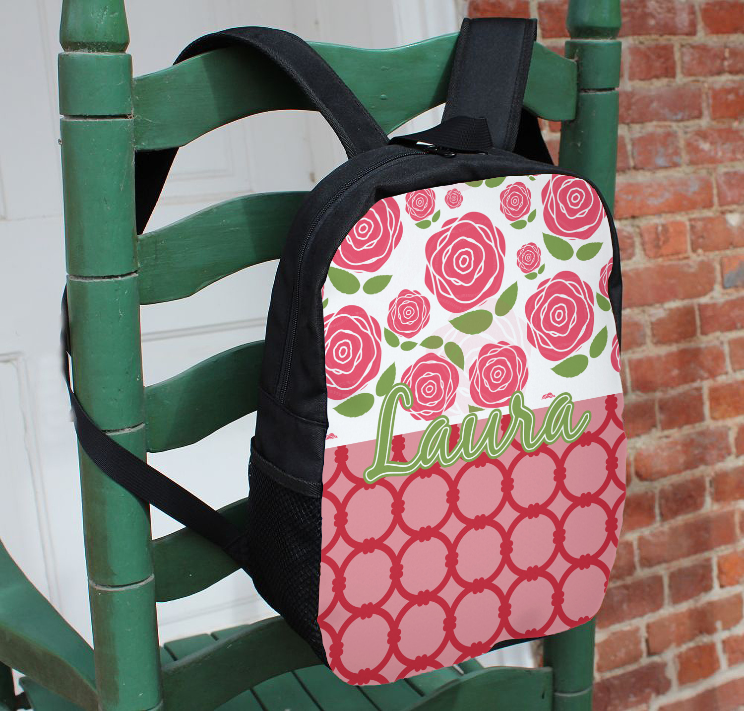 These small backpacks are made of a durable black canvas material with your personalization right on the front. The two shoulder straps are padded and easily adjustable. The bag itself measures at about 11" W x 15" H x 5" D. It's the perfect size for elementary aged kids or adults who want a smaller backpack. On the top of the bag you will find a handle to hang or carry your backpack by as well as a large zipper closure to keep all of your belongings safe inside. On each side of your backpack is a mesh pocket for a small item or water bottle. Inside your backpack you will find a spacious area with a small zipper pocket and a padded laptop slot that will fit up to a 13" laptop (13" being very snug). This is the perfect bag for any student that needs a couple books and their laptop with them at all times. It also works great as a carry on for traveling!