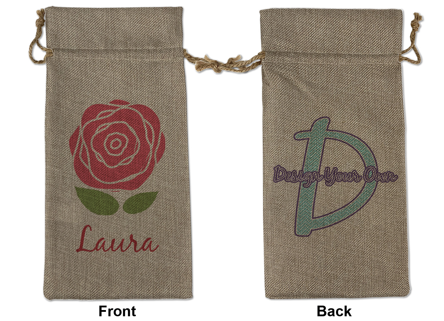 We sell our Burlap Gift Bags in 3 variant sized bags. Made with burlap polyester, each personalized bag can be secured with a twine drawstring pull. Your custom design is available to print on one side or both sides - completely up to you! The sizes of the bags measure approximately 4.5" x 6.5" for the smallest size, 6.5" x 8.0" for the medium size, and 6.5" x 13.5" for the large-sized bag.