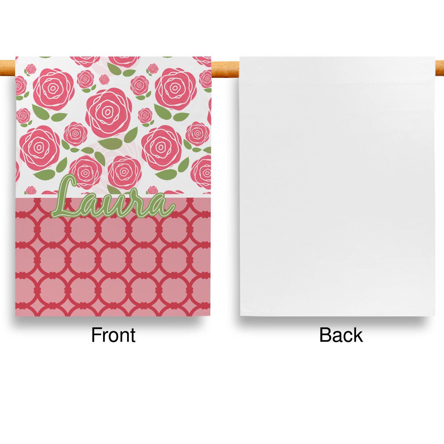 These custom garden flags are made of a durable, double-ply, polyester weave, allowing them to withstand the elements year round. The small flags measure at approximately 12 by 18 inches. The large flags measure out to 28 by 37 inches. You can order these decorative flags with your customization printed on the front only, or the front and back.