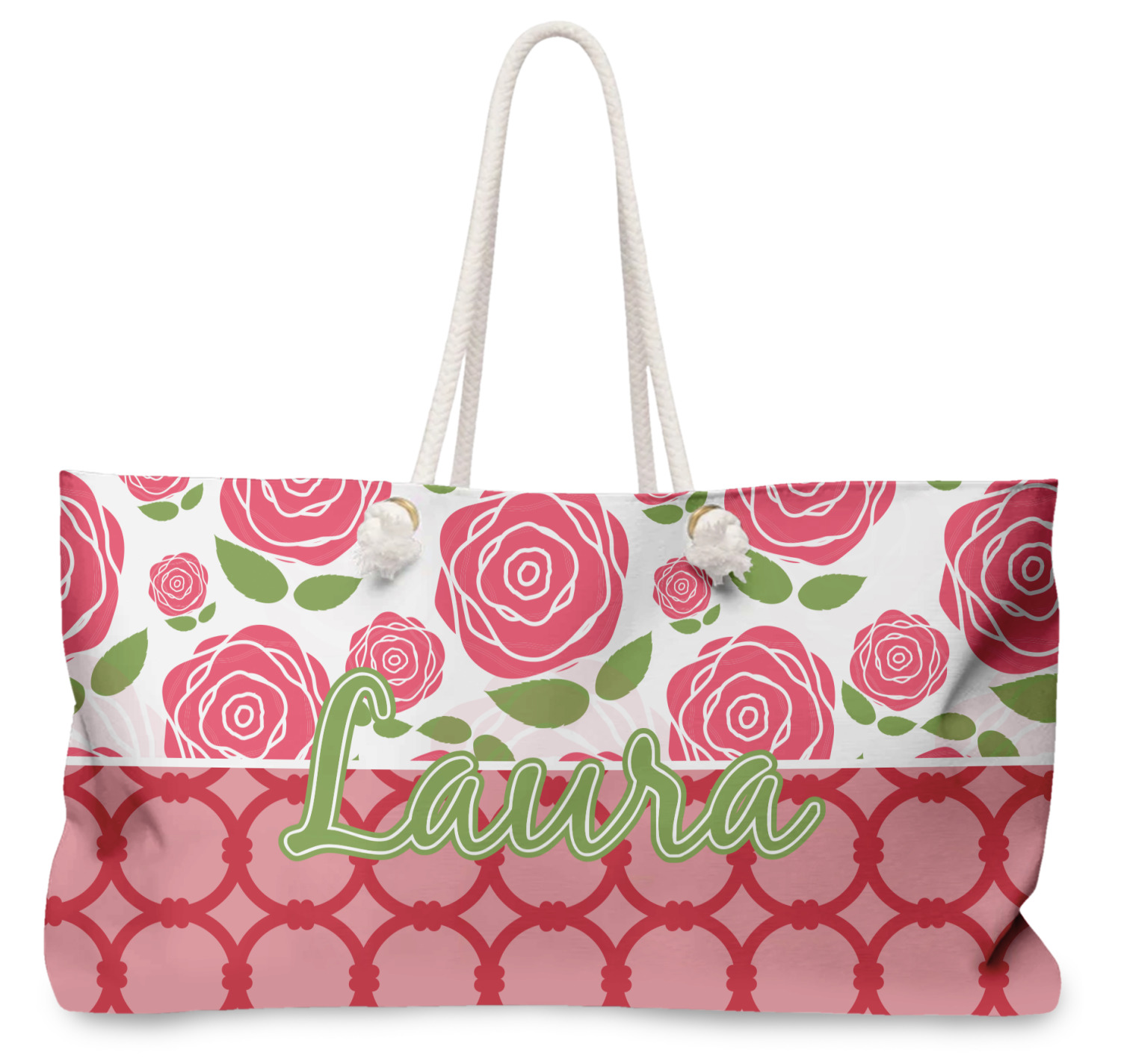 Our oversized weekender tote with rope handles is perfect for your weekend at the beach or on the town. This large tote are 24" W X 13" H, with a 5" gusset and a 27" thick rope handles with a knot that is put through a grommeted brass hole.