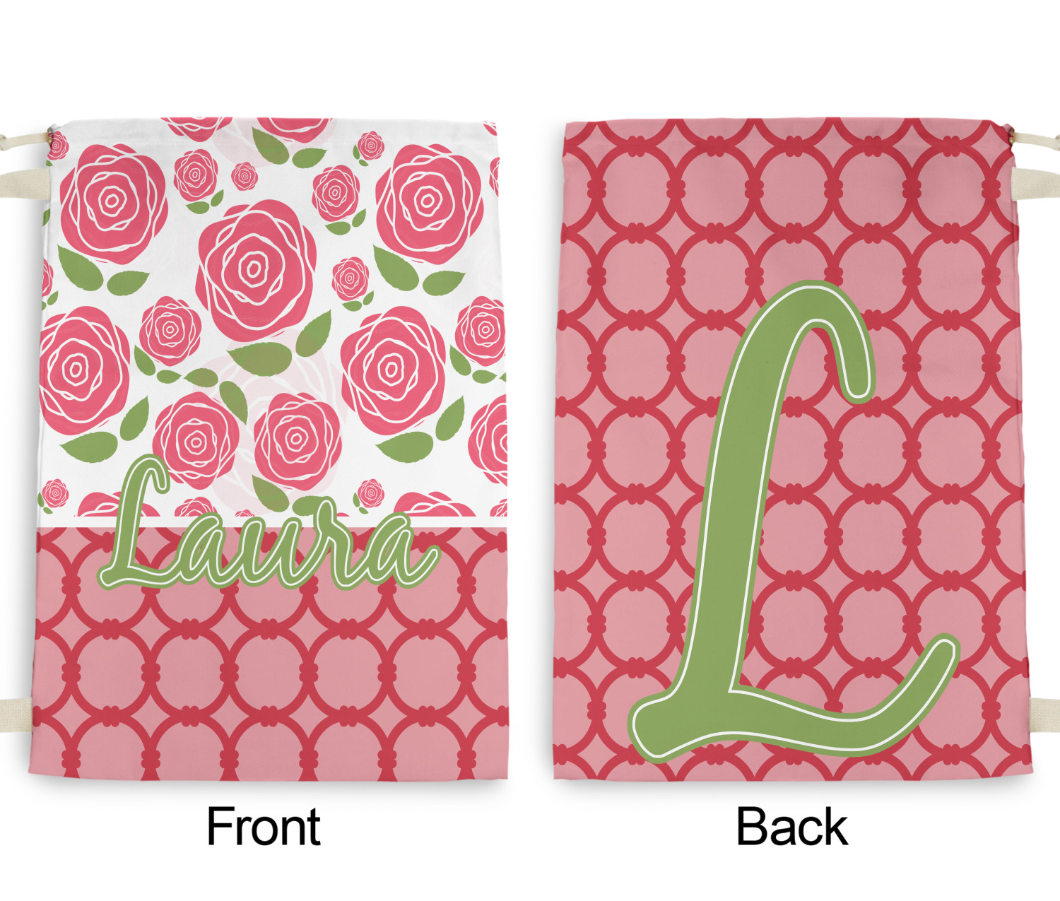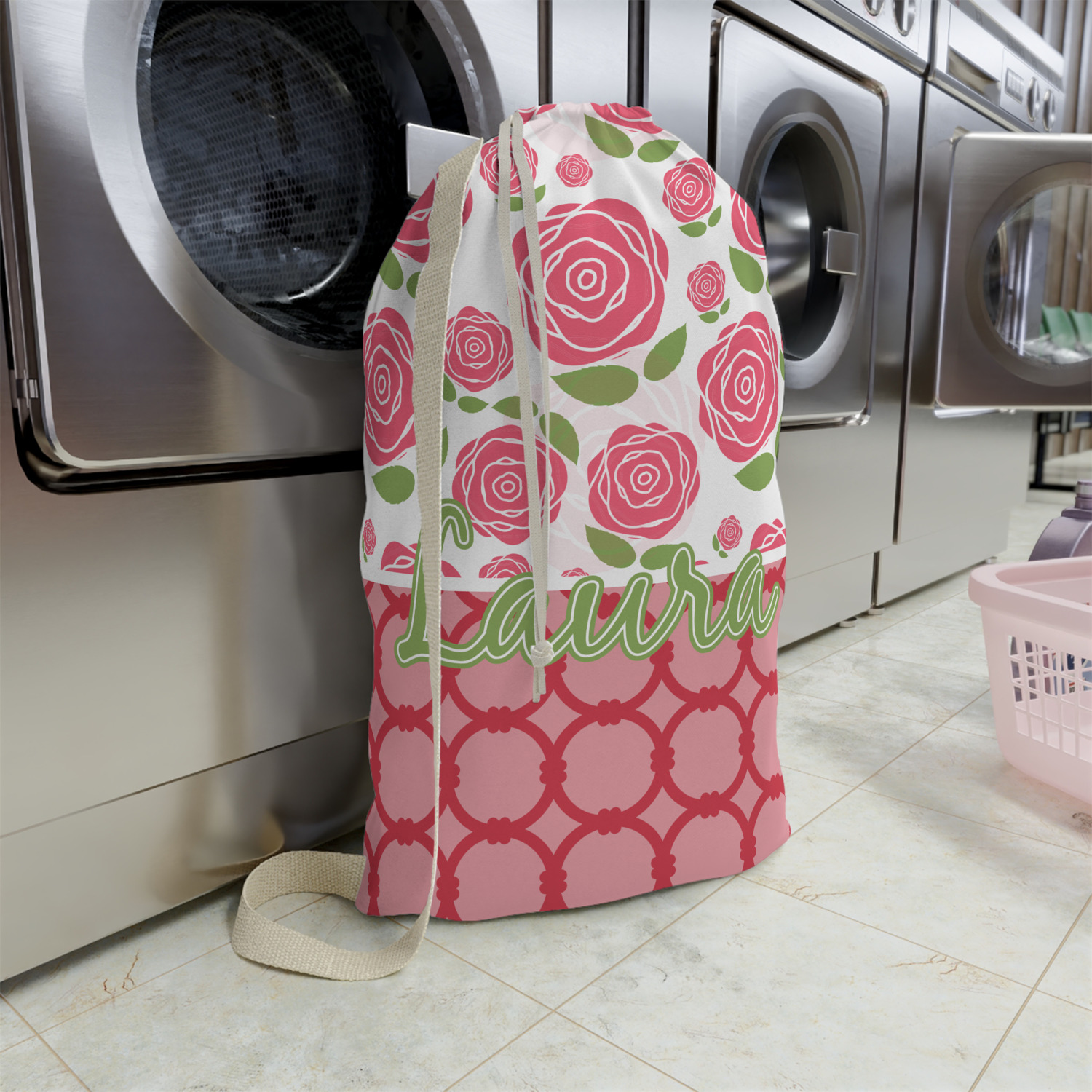 Carry your laundry in style with these customized laundry bags. Available in two sizes, featuring a natural colored woven strap and a cinch cord, these bags hold a lot of clothes or anything else you want to fit in them.