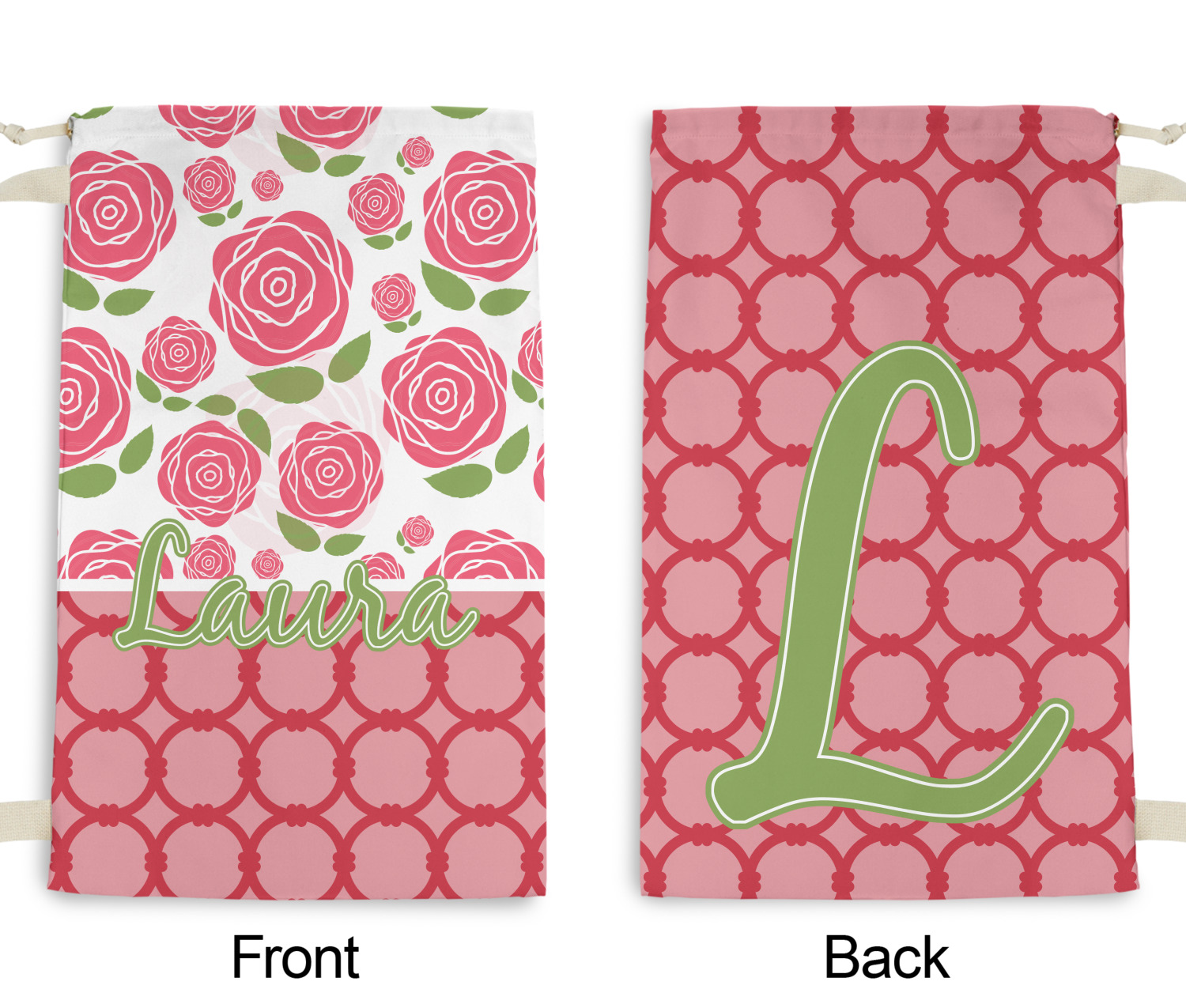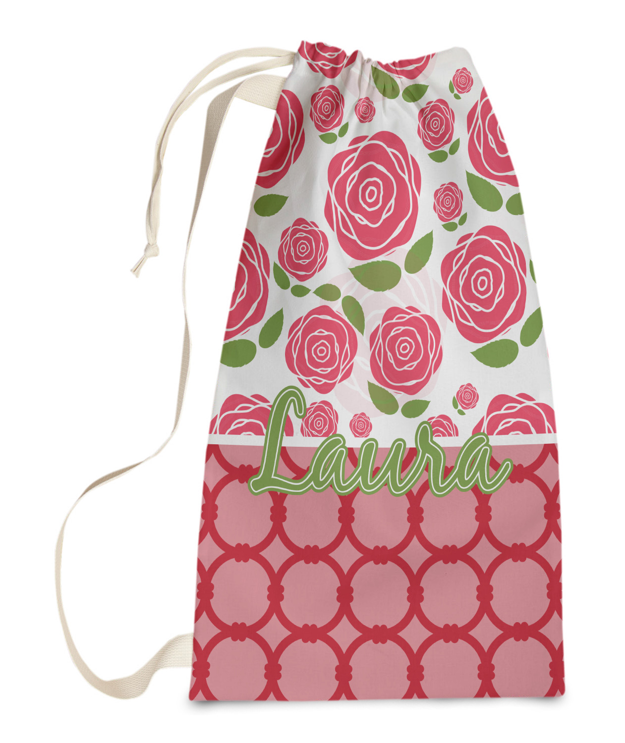 Carry your laundry in style with these customized laundry bags. Available in two sizes, featuring a natural colored woven strap and a cinch cord, these bags hold a lot of clothes or anything else you want to fit in them.