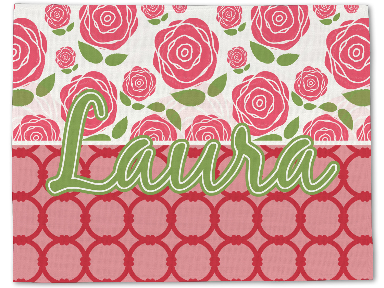 For our two pattern layout design, we chose to pair the rose pattern with our connected circles tone on tone design. We chose to personalize with just a name in one of our popular fonts (Black Jack) and we put a double stroke on the name.