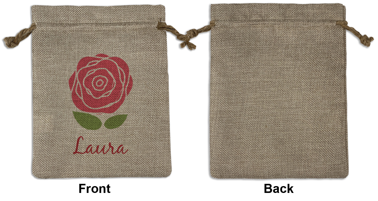 We sell our Burlap Gift Bags in 3 variant sized bags. Made with burlap polyester, each personalized bag can be secured with a twine drawstring pull. Your custom design is available to print on one side or both sides - completely up to you! The sizes of the bags measure approximately 4.5" x 6.5" for the smallest size, 6.5" x 8.0" for the medium size, and 6.5" x 13.5" for the large-sized bag.