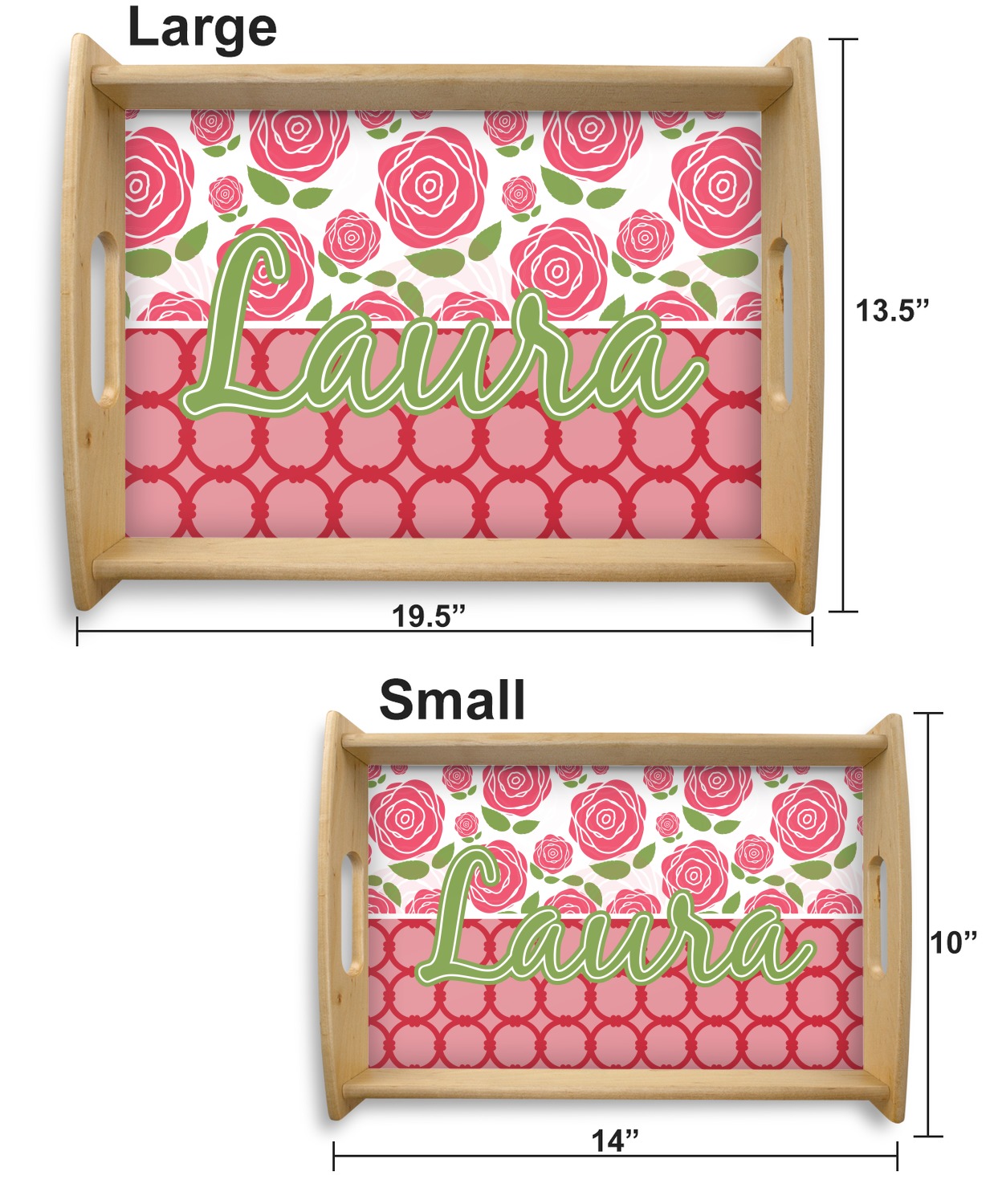 This serving tray with handles features square edges and two rounded sides, creating a very modern look. Each side is fabricated from a beautifully cut, natural wood. The bottom of the interior of the tray displays your customized design in bright, vibrant color. The tray is sold in both a black color and a natural wood look. Each variation of the wood serving tray has two sizes: Small, which is 14" x 10" x 2.25", and Large, which is 19.5" x 13.5" x 2.75".