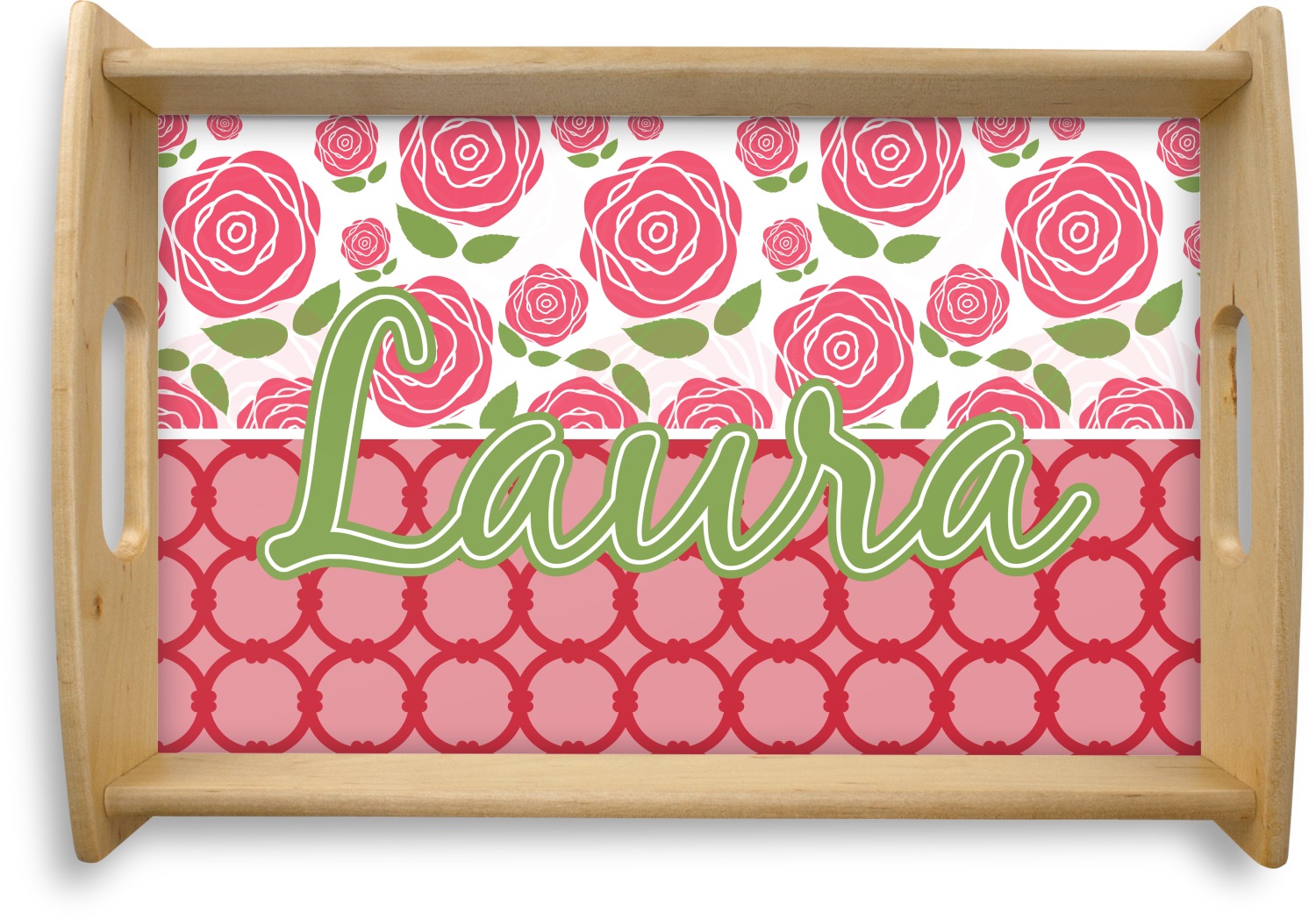 This serving tray with handles features square edges and two rounded sides, creating a very modern look. Each side is fabricated from a beautifully cut, natural wood. The bottom of the interior of the tray displays your customized design in bright, vibrant color. The tray is sold in both a black color and a natural wood look. Each variation of the wood serving tray has two sizes: Small, which is 14" x 10" x 2.25", and Large, which is 19.5" x 13.5" x 2.75".