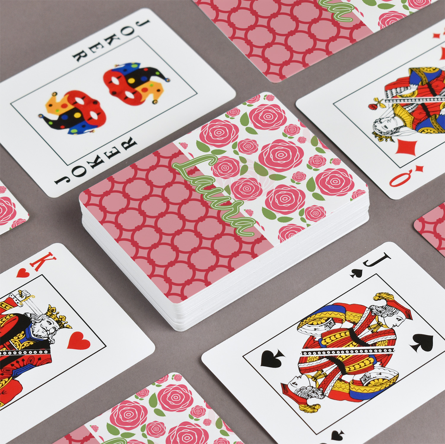 The customization / personalization is printed on the back side. The playing cards have a low gloss coating on both sides. The cards are packaged in a clear plastic box.