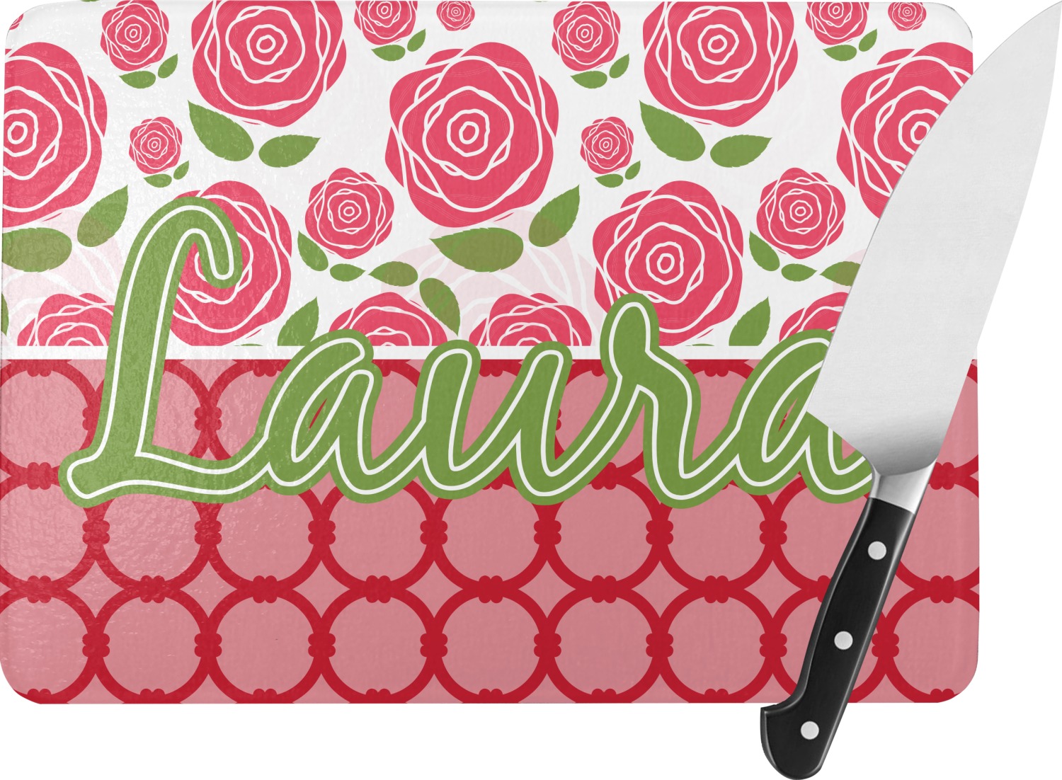 For our two pattern layout design, we chose to pair the rose pattern with our connected circles tone on tone design. We chose to personalize with just a name in one of our popular fonts (Black Jack) and we put a double stroke on the name.