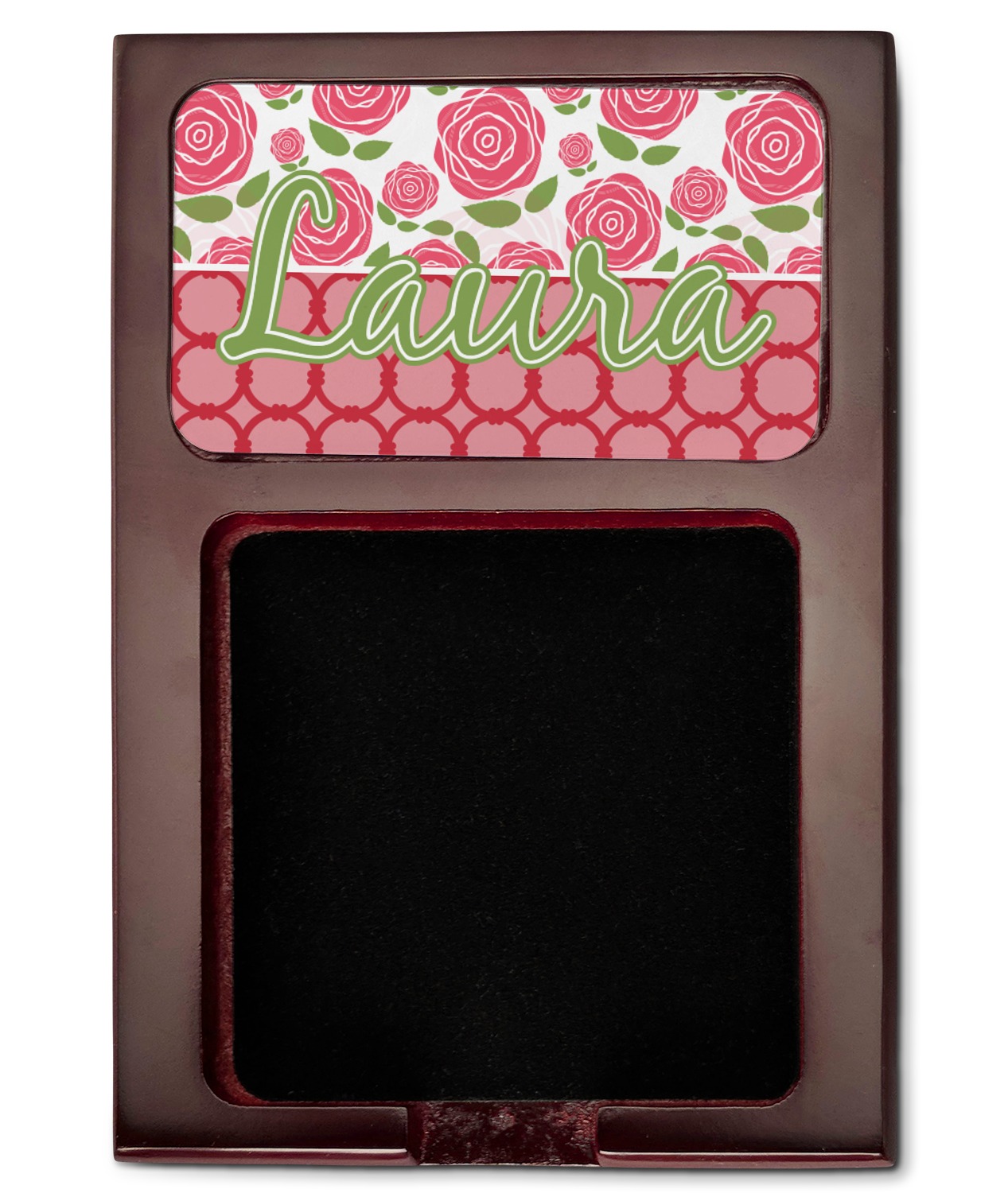 Crafted from a fine mahogany, this post it note holder is in the shade of a dark, cherry color. The dispenser itself is about 4.25 by 6.25 by 0.75 inches. You can place your 3 by 3 inch sticky notes in the indentation below the nameplate. We print your customization onto the nameplate that rests above the velvety indentation.