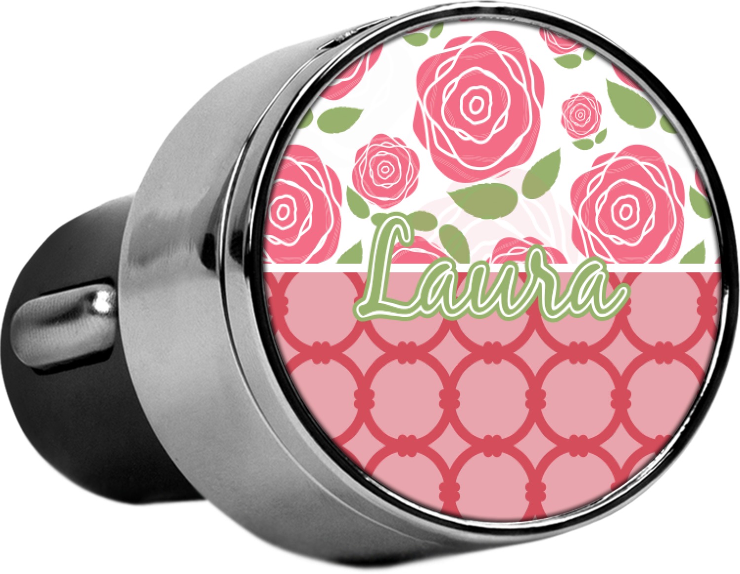 This car charger adapter converts your cars bland cigarette lighter into a decorative, personalized, and operational USB charging port. Made of solid, silver-plated metal, these chargers feature a flip-open lid that both displays your customized design and conceals two USB ports. The metal lid of the USB car charger adapter is 1.5" in diameter and seals due to a small, ingrained magnet on both the charger and its lid. The cigarette lighter insert, itself, is colored black.