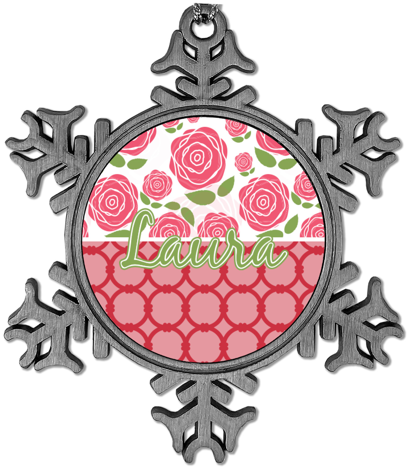 The snowflake shape ornament is an everlasting pewter material with a circular center to display your photo or design, giving it a unique vintage ornament look. Our personalized Christmas ornament comes in a small gift box for keepsake sure to preserve your picture ornament until the next holiday season. The snowflake shape is approximately 3 x 3 with a small silver accent string perfect for hanging. We print your photo or design in the center of the ornament with a size that is roughly 1.75 in diameter.