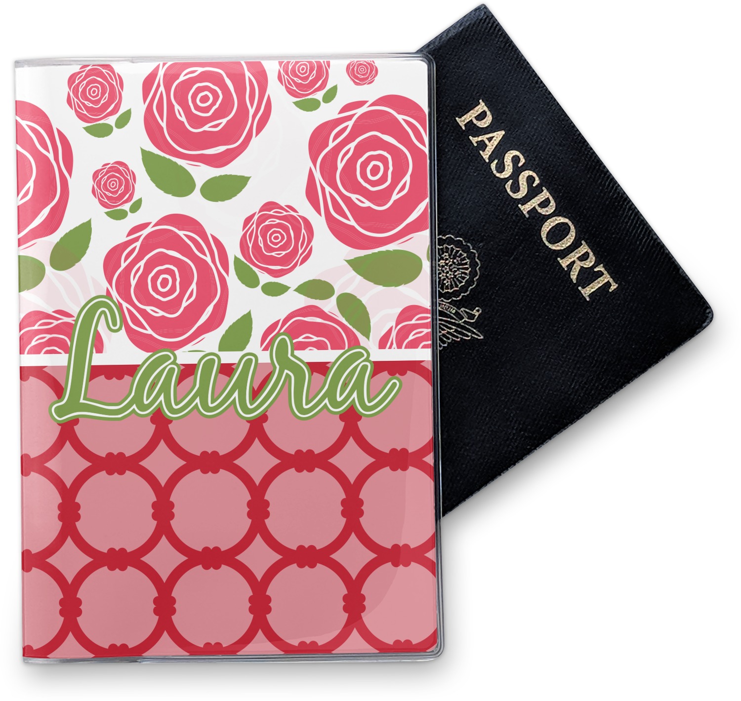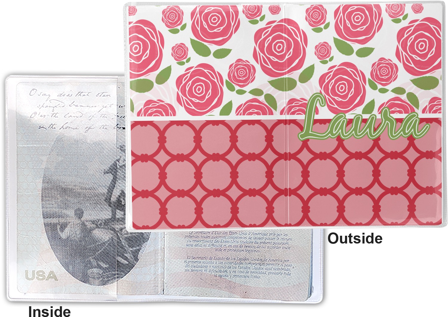 This cover is made of a sturdy clear vinyl with a personalized vinyl insert inside. There is a large and a small pocket on either side to hold the covers of your passport easily and firmly. The passport holder is approximately 7.5" x 5.25", the perfect size to snugly fit your passport. This slim cover is the perfect way to protect your passport without being one more bulky item you have to carry.