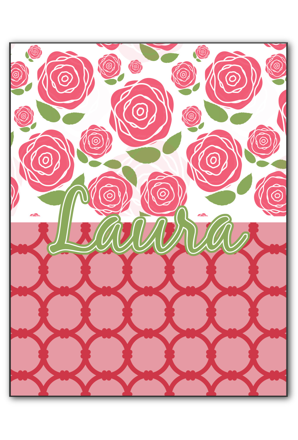 For our two pattern layout design, we chose to pair the rose pattern with our connected circles tone on tone design. We chose to personalize with just a name in one of our popular fonts (Black Jack) and we put a double stroke on the name.