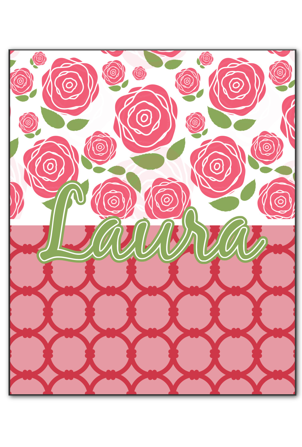 For our two pattern layout design, we chose to pair the rose pattern with our connected circles tone on tone design. We chose to personalize with just a name in one of our popular fonts (Black Jack) and we put a double stroke on the name.