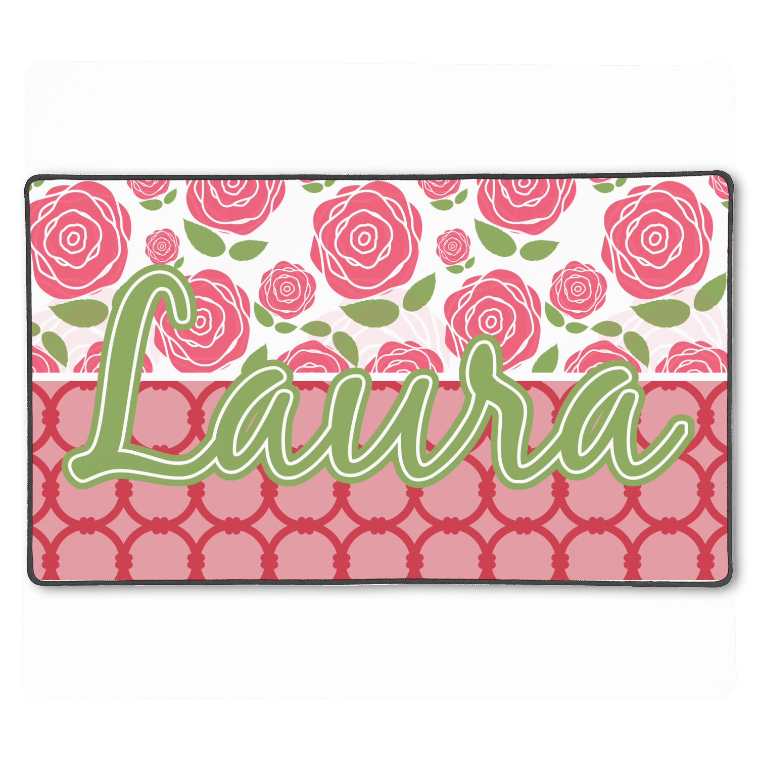 For our two pattern layout design, we chose to pair the rose pattern with our connected circles tone on tone design. We chose to personalize with just a name in one of our popular fonts (Black Jack) and we put a double stroke on the name.