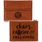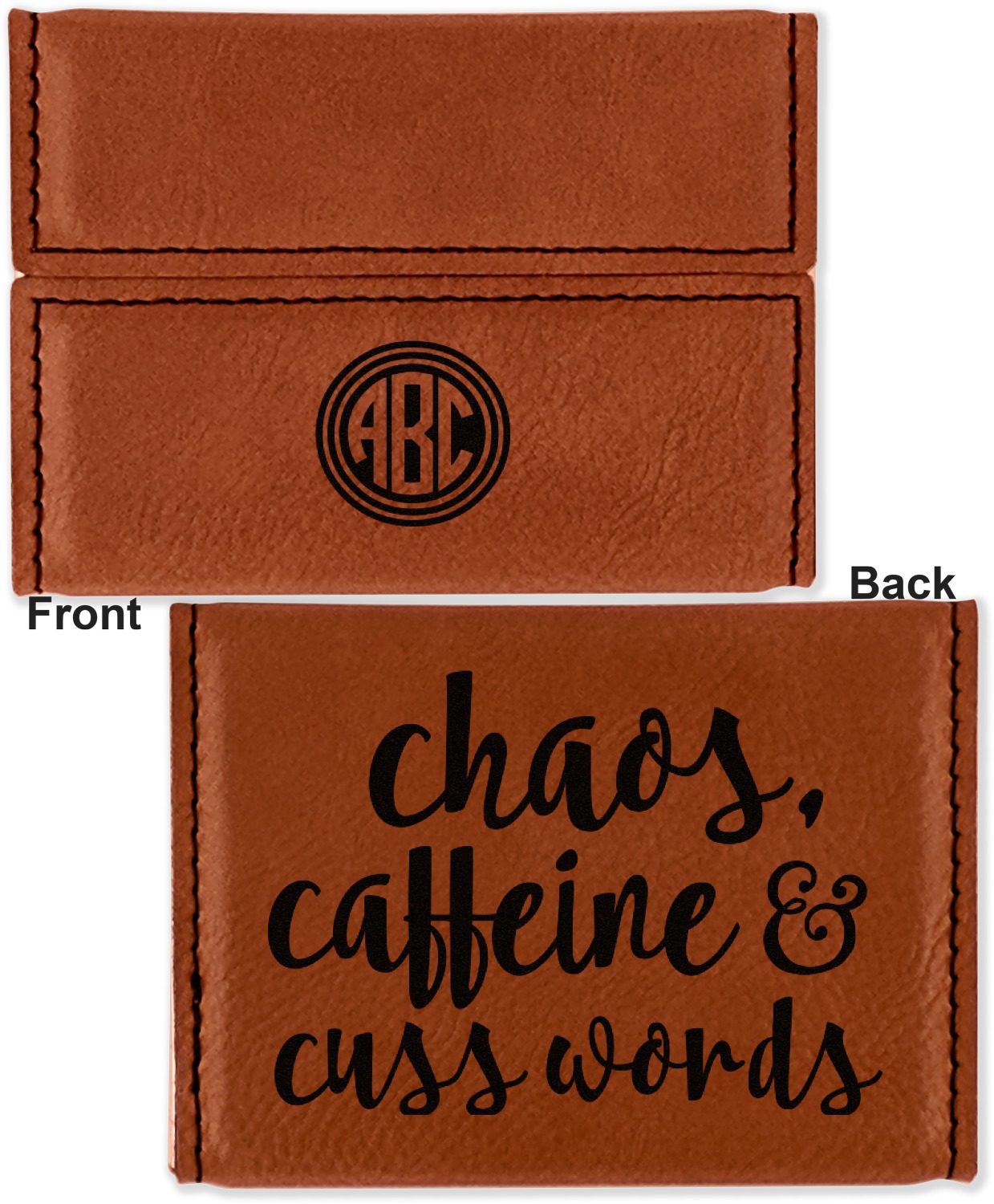 Your personalized design is laser engraved onto either the front, or the front and back of the card holder, depending on the model you purchase. Once engraved, the design will appear a darkened black against the cognac color of the leatherette.
