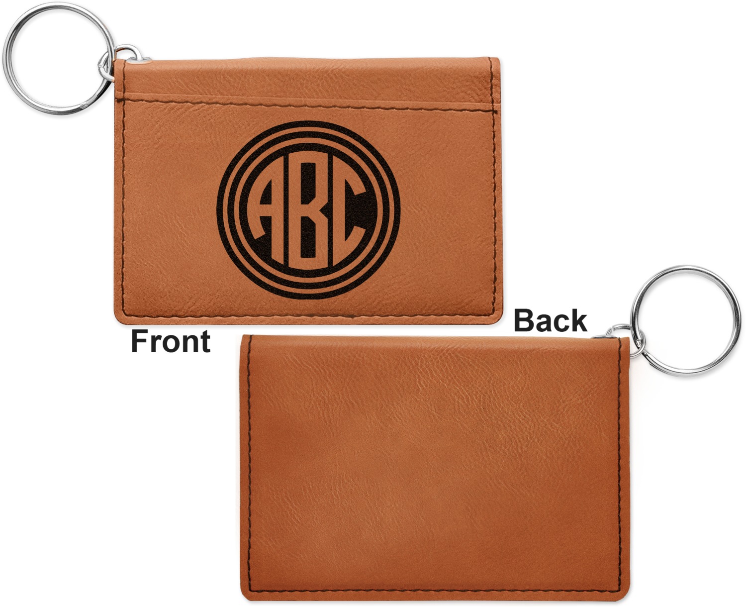 These ID wallet keychains features three pockets on the inside to accommodate your ID and your most frequently used cards. Another pocket occupies the front of the wallet's exterior, and can hold some cash or another card. The wallet is accompanied by a thick metal ring for easy attachment to a belt clip or purse. Each card holder keychain measures at 4.25 by 3 inches and is a beautiful, cognac, medium-brown shade. The personalized monogram, font, or graphic of your choosing is laser engraved into the surface of the wallet, creating a black imprint. We sell these ID wallets in two models: single sided and double sided engraving.