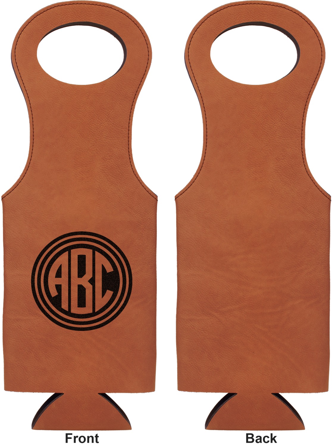 This wine carrier is made from a stunning leatherette, in a cognac-brown color. Strong, black stitching lines the sides of your wine bottle bag and provides extra durability. The interior is lined with a padded, black material to allow for a snug fit once your bottle is placed inside. At the top of this wine gift bag, you'll find two oval shaped handles that elegantly complements the rest of the bag's style. We provide you with the option of laser-engraving the front, or the front and back of your new personalized wine bag!