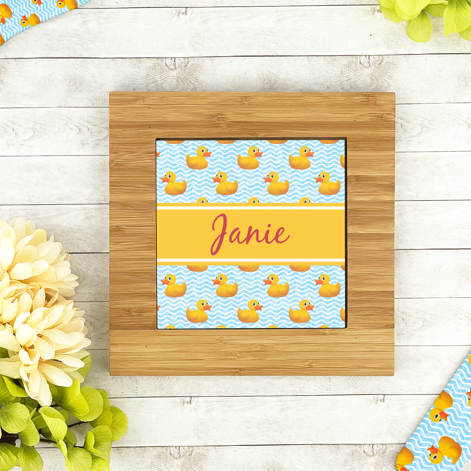 Rubber Duckies are as popular as ever. Our rubber duckie design features traditional yellow rubber duckies on a waves background. The duckies are floating around in water. Cute, adorable and simply precious are words that come to mind when looking at this design.