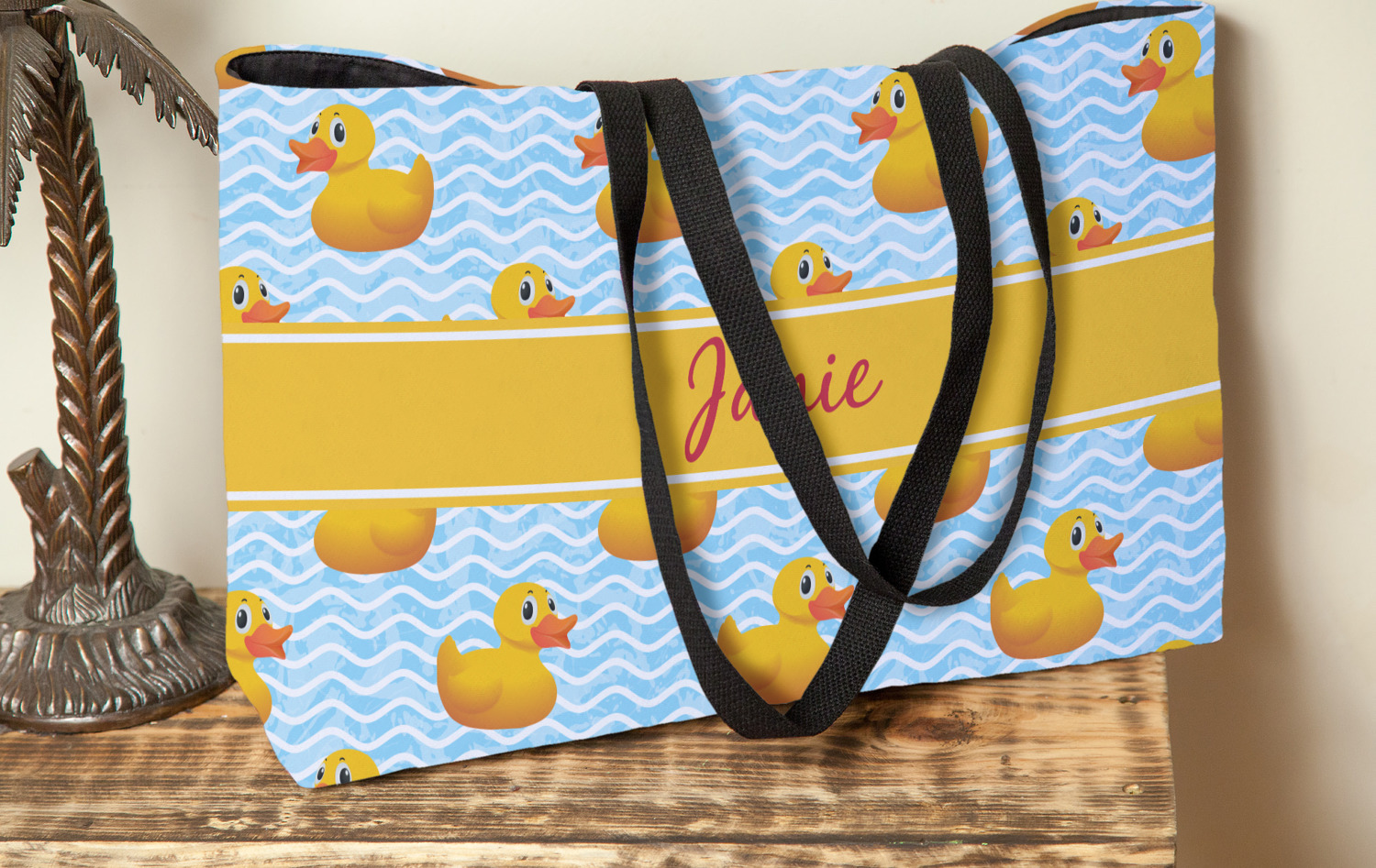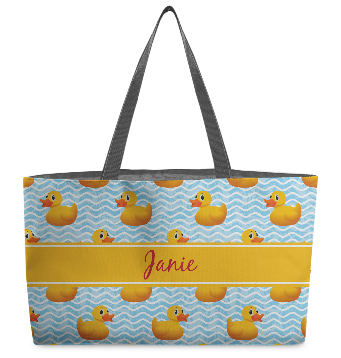 These beach totes are handmade here in the USA. Fabric is printed with your design. The tote is then sewn from the fabric pieces, lining and handles added.