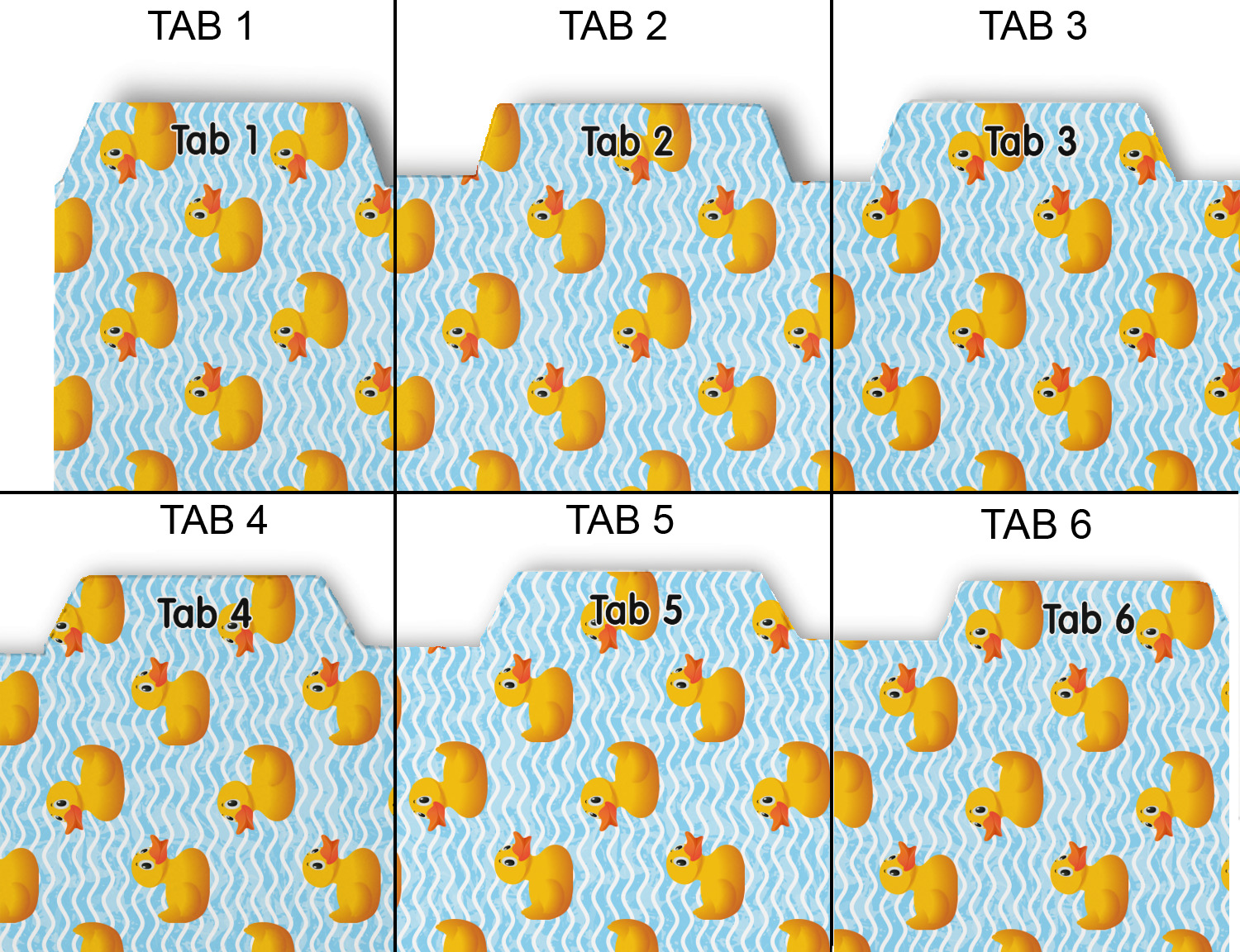 Whether you use binders at school or at work, we have designs to suit all of them. Available in 5 or 6 tab sets, you are sure to find a set to suit your needs. The back of each one is white and can be used to take notes, write vital information on, etc.