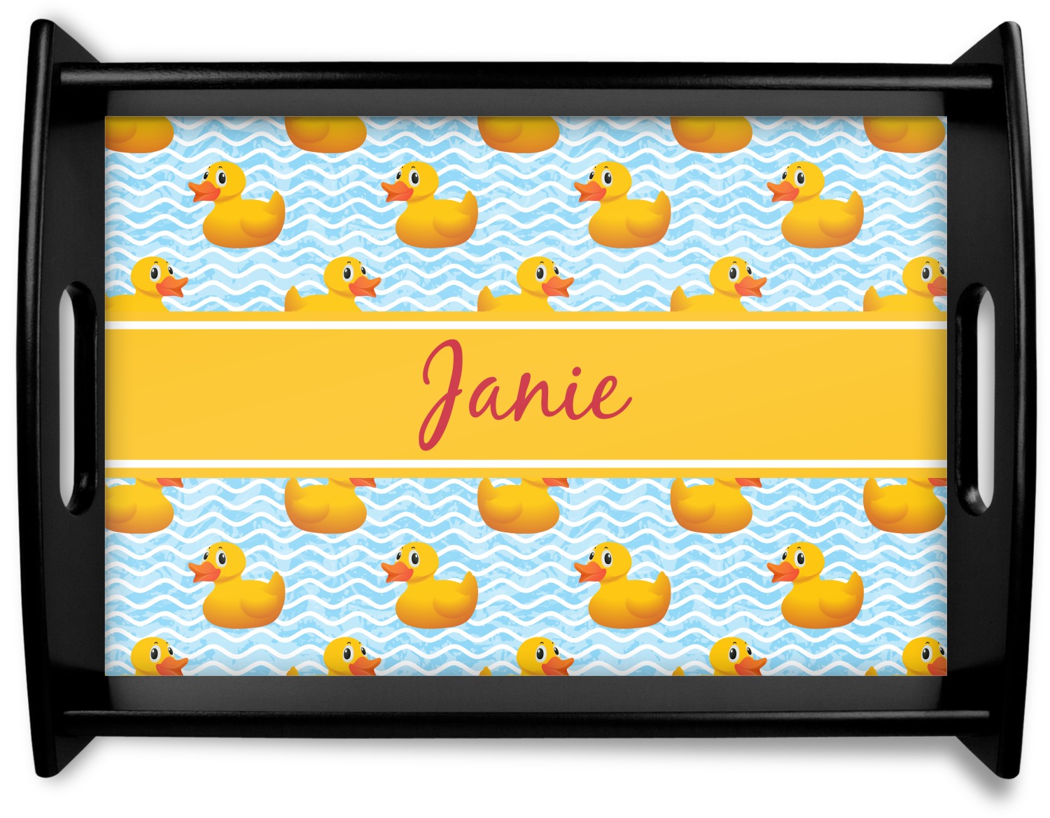 This serving tray with handles features square edges and two rounded sides, creating a very modern look. Each side is fabricated from a beautifully cut, natural wood. The bottom of the interior of the tray displays your customized design in bright, vibrant color. The tray is sold in both a black color and a natural wood look. Each variation of the wood serving tray has two sizes: Small, which is 14" x 10" x 2.25", and Large, which is 19.5" x 13.5" x 2.75".