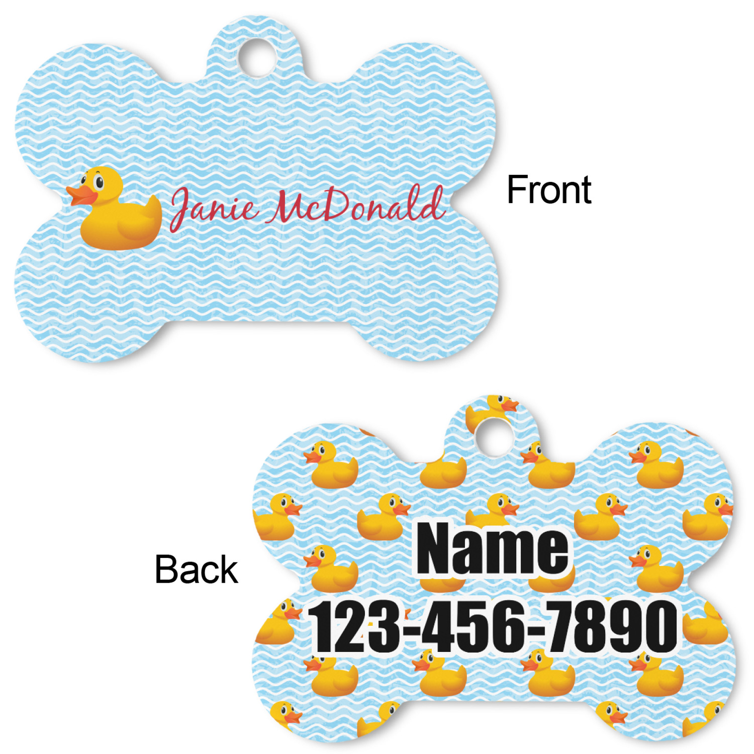 Our default design templates print your dog's personalization on the front and your contact information on the back; however everything is customizable, so you customize the patterns, the colors, the personalization, the contact information etc.