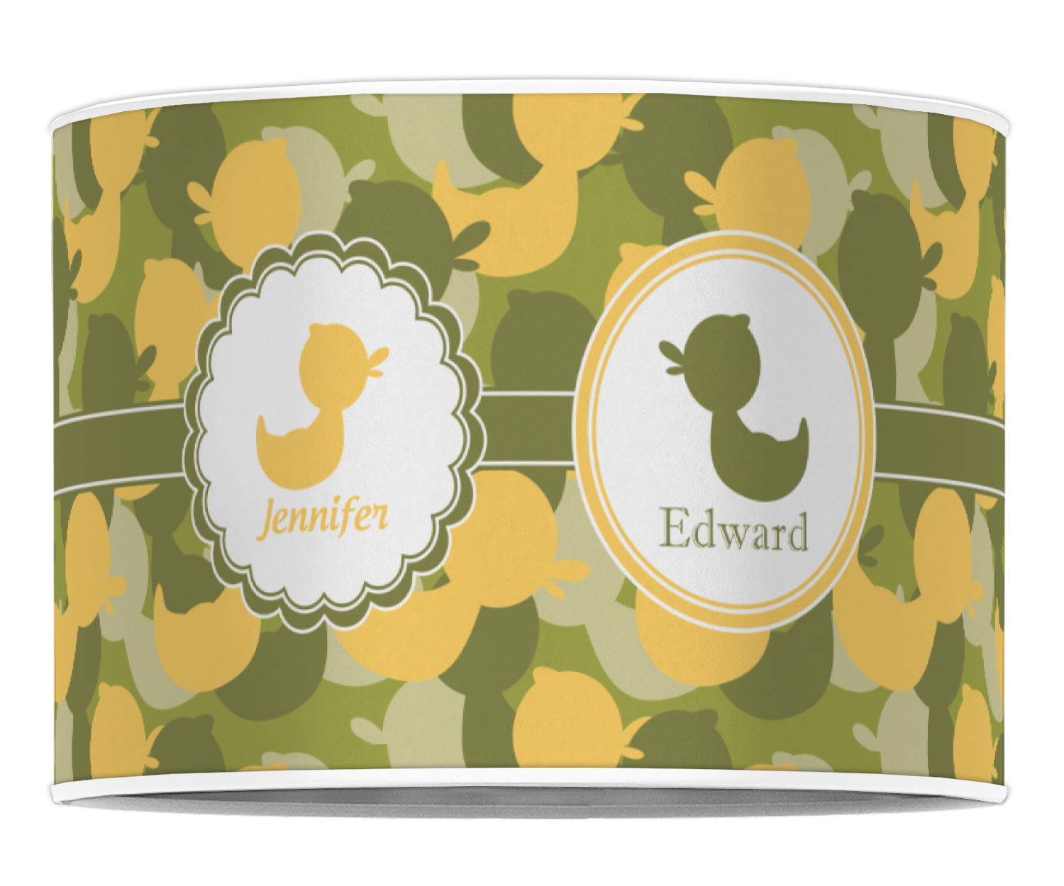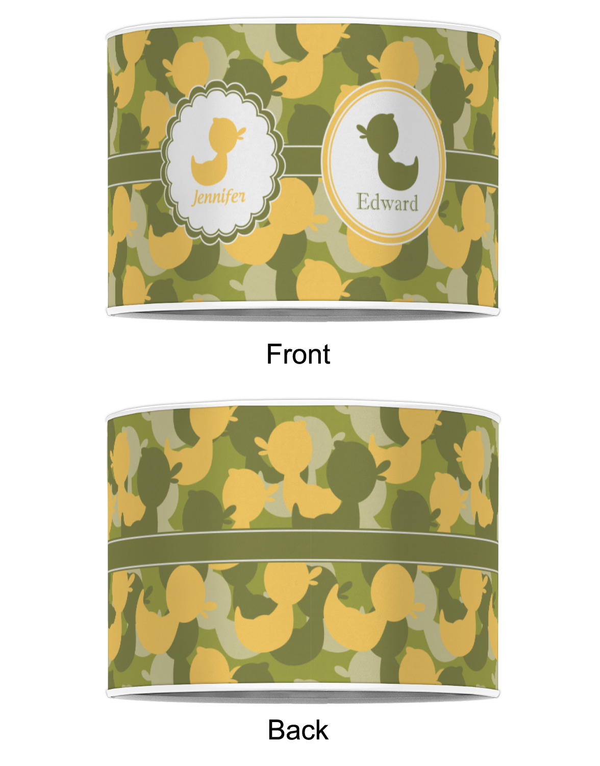 We chose to use a couples / twin personalization on our duck camo design. We used two labels - one is a girl round scalloped, while the second label is a simple round. We used the duck graphics from the camo pattern and used names below the graphics for personalization.